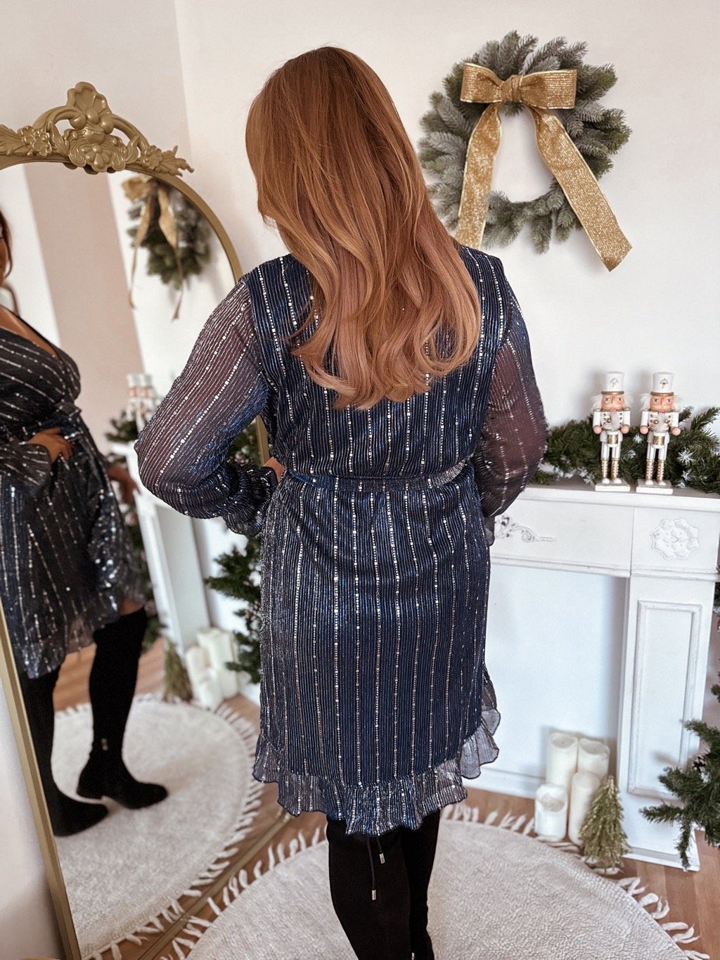 Kék V-nyakú miniruha, gumis derékrésszel és hosszú ujjakkal. A modell 168 cm magas és L/XL méretet visel.