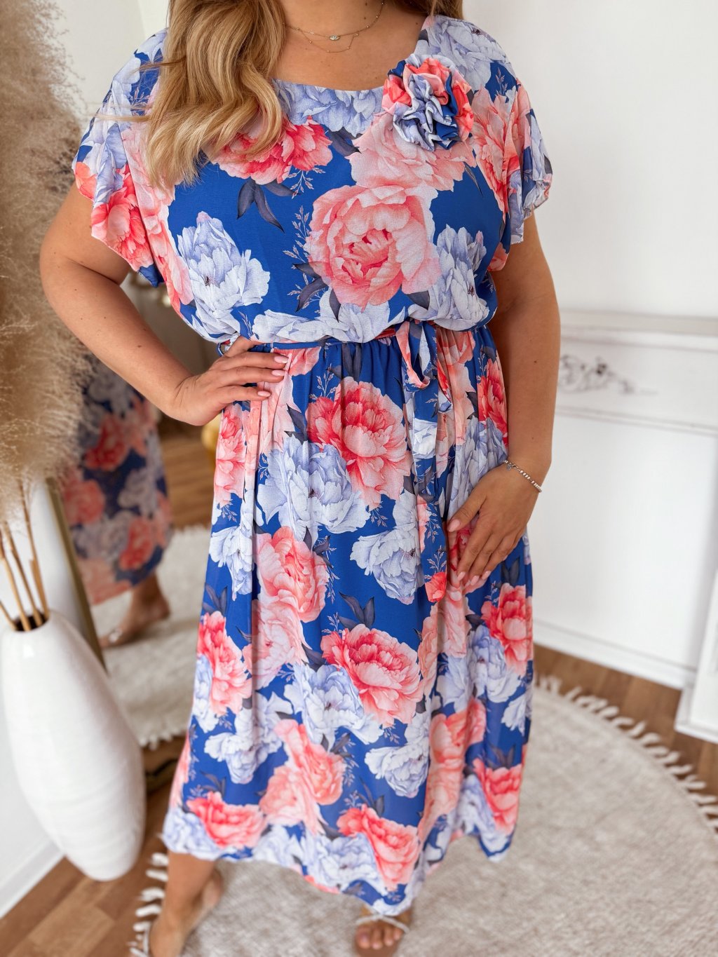 Finom női ruha, rövid ujjú és levehető brossal, lazább szabással és elasztikus derékpánttal. A modell 168 cm magas és L/XL méretet visel.