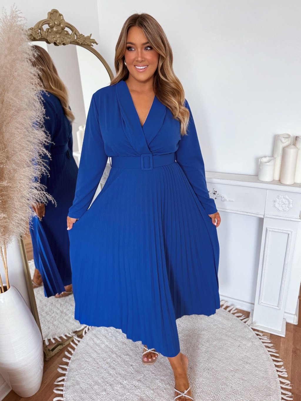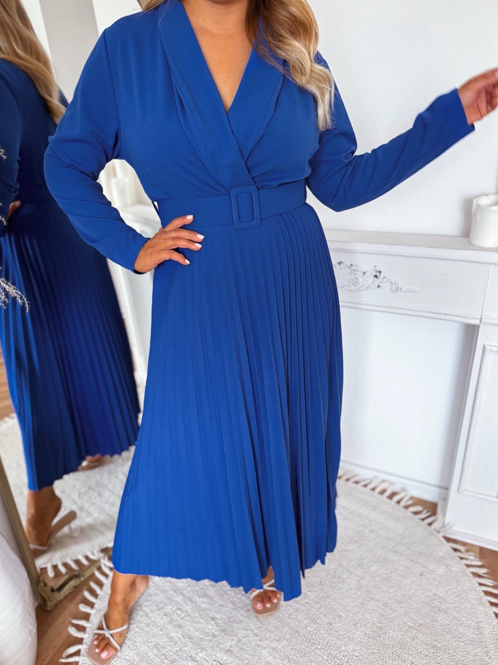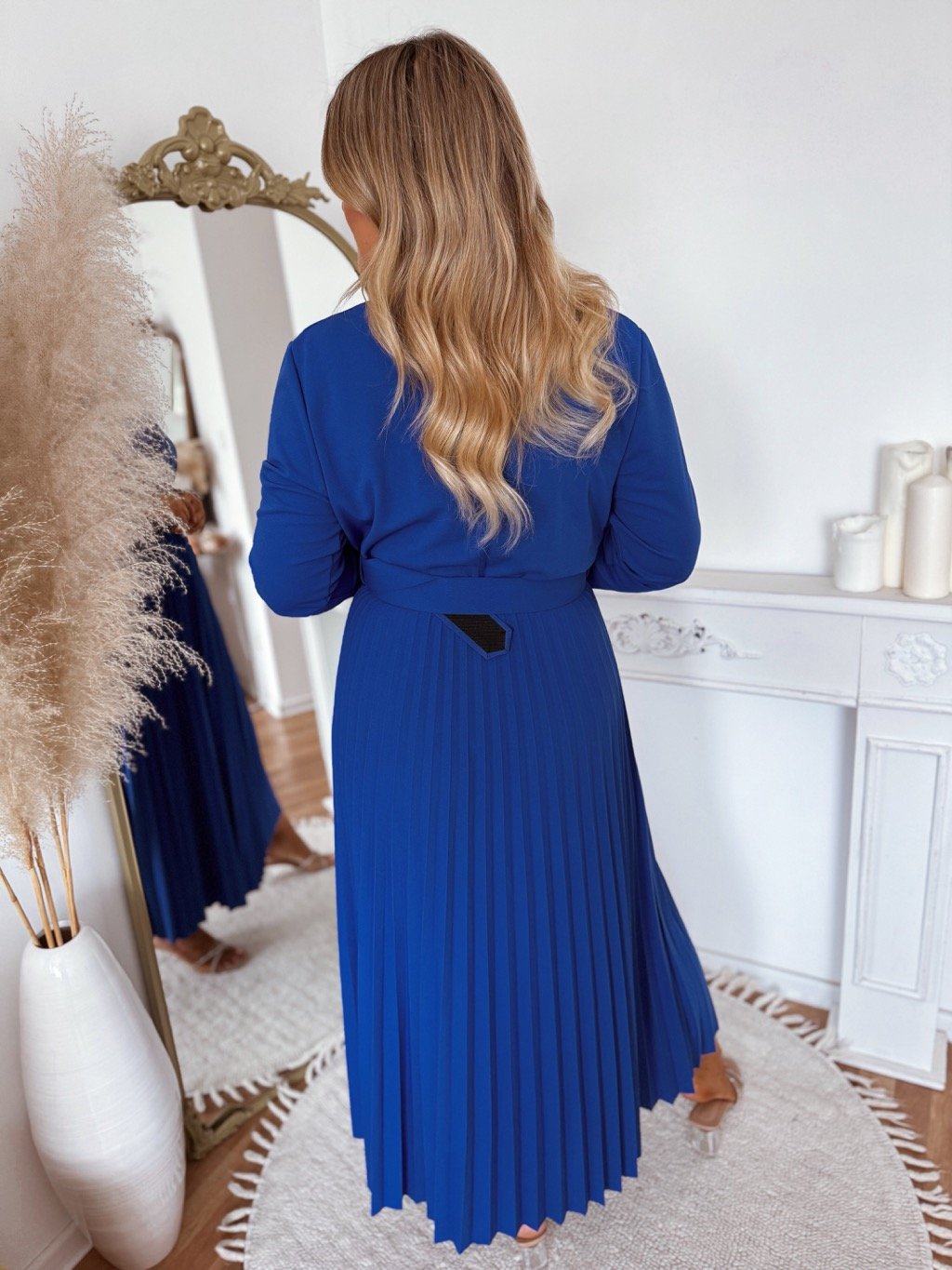 Elegáns, rakott szoknyás ruha elasztikus derékpánttal. A ruha csípő tájékán teljesen bő. A modell 168 cm magas és L/XL méretet visel.