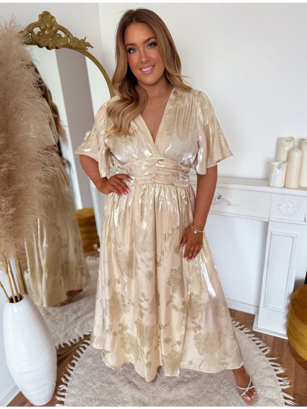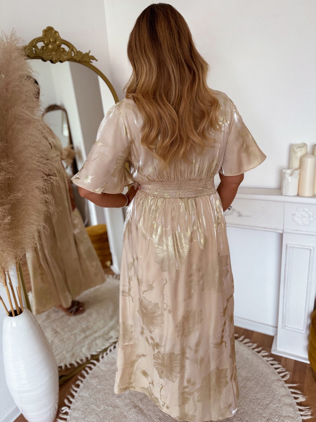 Hosszú, krémszínű-arany női ruha molett alkatúaknak, rövid ujjú és hasítékkal. A ruha derekán gumírozás található. A model mér 168 cm, és XL-es méretet visel.