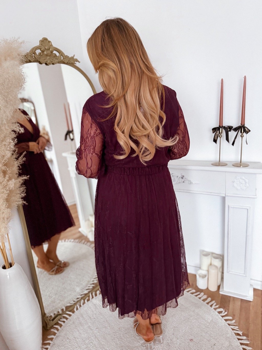 A laza, midi hosszúságú csipke ruha derekában gumírozással. A ruha univerzális méretű, XL-3XL méretre illik. A modell 168 cm magas és Univerzális méretet visel.