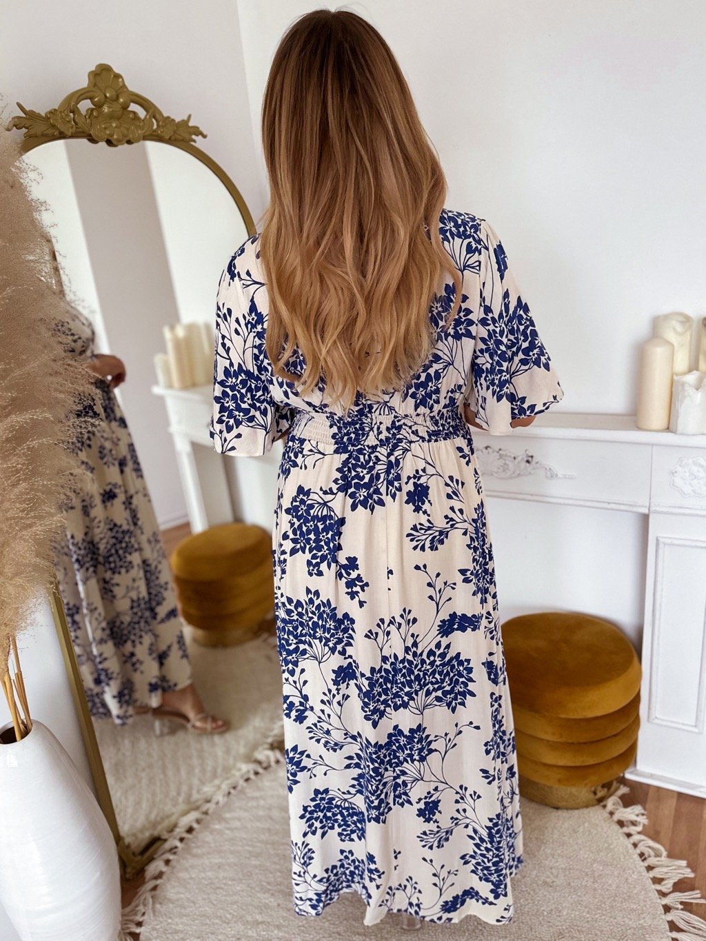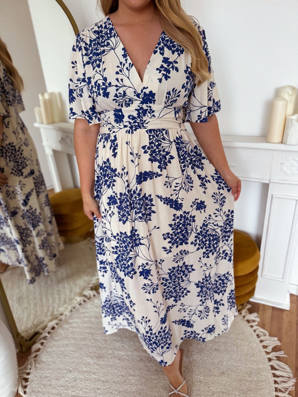 Hosszú, rövid ujjú nyári ruha moletteknek. A ruha ízléses kivágással rendelkezik, amely gyönyörűen kiemeli a dekoltázst, és rugalmas derékpánttal, amely alkalmazkodik a testalkathoz. A könnyű, légáteresztő anyag ideális a nyári napokra, nyaralásra vagy különleges alkalmakra. A ruha szoknyája teljesen bő szabású. A ruha rugalmas. A model mér 168 cm, és XL-es méretet visel.