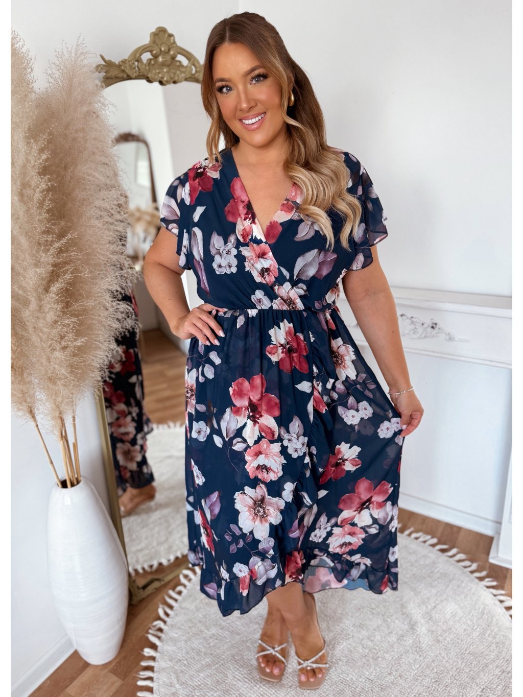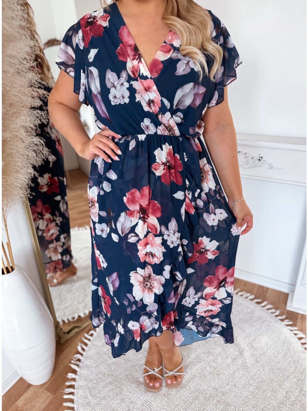 Elegáns, rövid ujjú, midi ruha, bő, fodros szoknyával. A ruha derekában gumírozás található. A feltűnő virágmintának köszönhetően ezek a ruhák tökéletes választás nyári ünnepségekre, esküvőkre vagy nyaralásokra. A modell 168 cm magas és L/XL méretet visel.