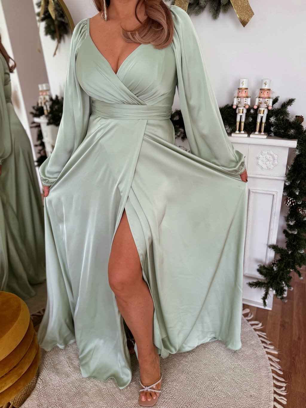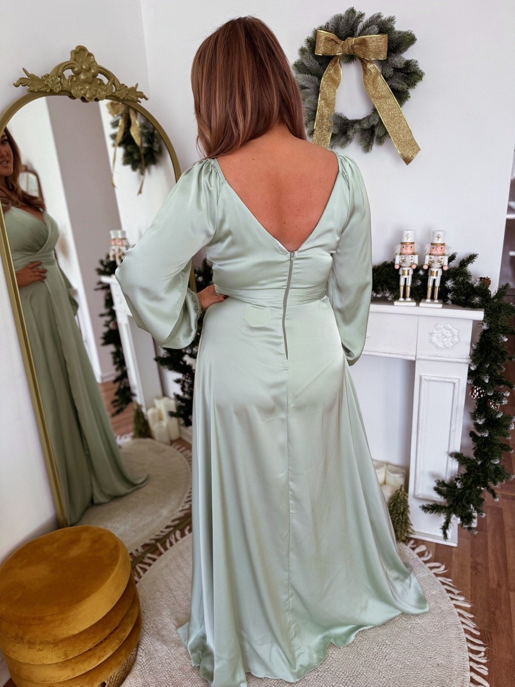 A szatén estélyi ruha hosszú ujjal, derékban karcsúsított, a szoknya teljesen bő, a ruha hátul cipzárral záródik. Ez a ruha nem rugalmas. A modell 168 cm magas és XL (42) méretet visel.