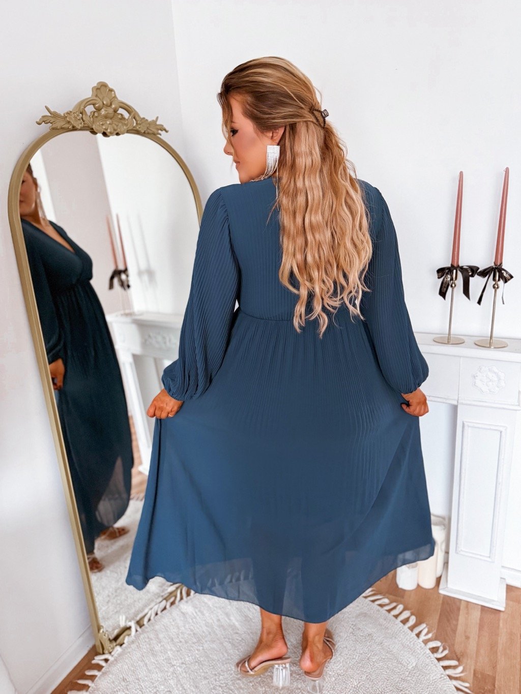 Az elegáns, hosszú ujjú, rakott ruha lazább szabású és gumis derékkal rendelkezik. A csillogó öv nem része a ruhának, a kiegészítők között találod. A ruha csípő tájékán teljesen bő. A modell 168 cm magas és L/XL méretet visel.