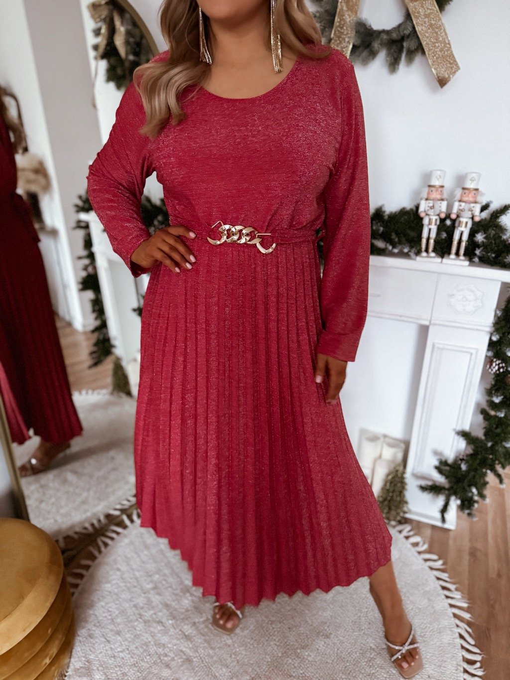Az elegáns ruha csillogó anyagból készült, övvel és gumírozott derékkal rendelkezik. A ruha rugalmas. A pliszírozott szoknyájú ruha bő szabású. A modell 168 cm magas és L/XL méretet visel.