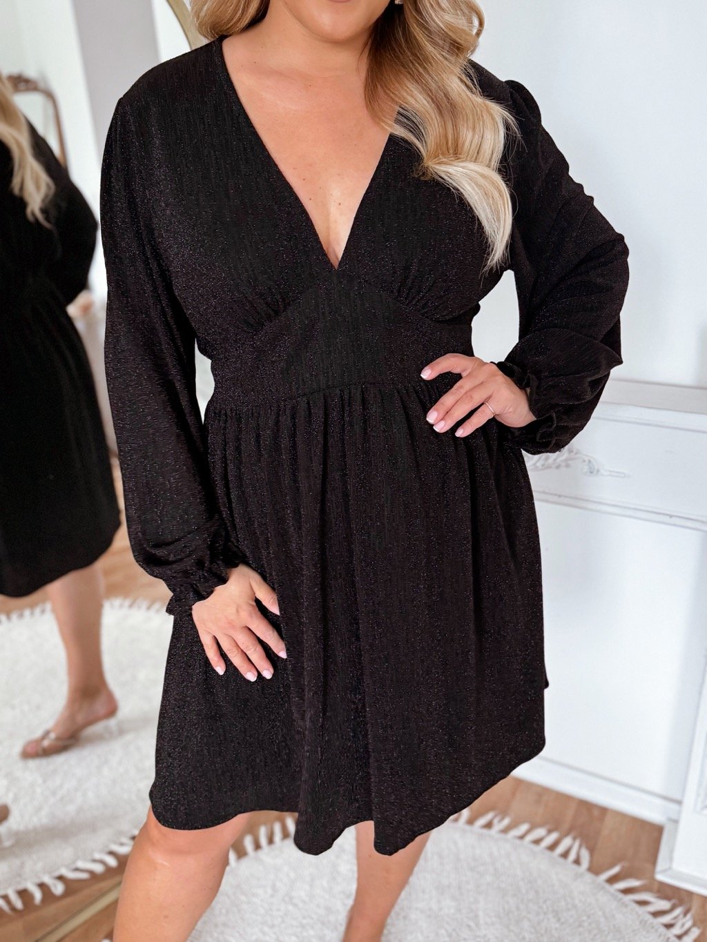 A moletteknek szánt rövid fekete ruha nagyon rugalmas és alkalmazkodik a testalkathoz. A model mér 168 cm, és XL-es méretet visel.