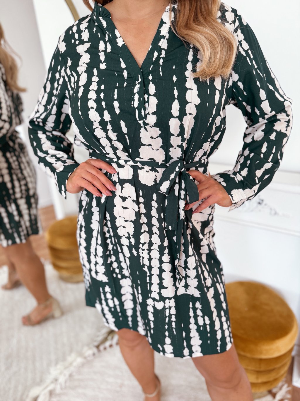 A rövid ujjú, hosszú ujjú ruha laza szabású, és övvel összehúzható a deréknál. A model mér 168 cm, és XL-es méretet visel.