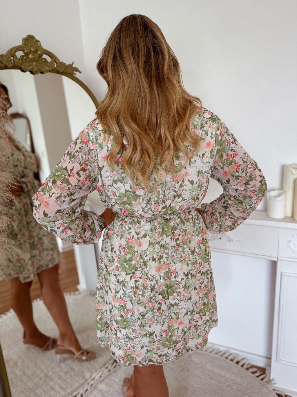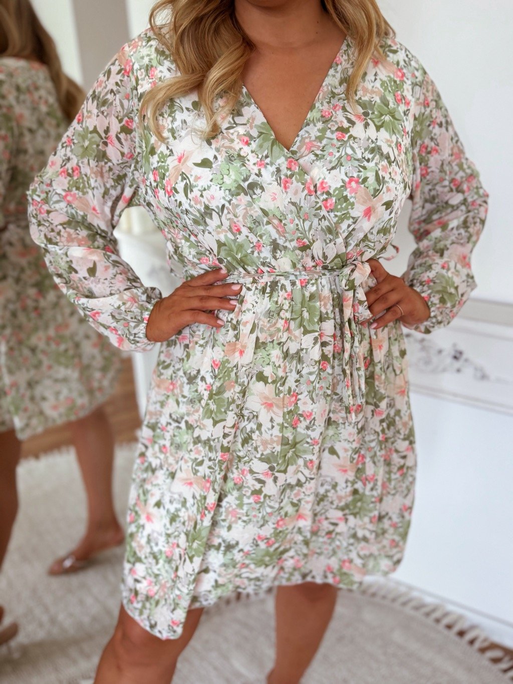 A romantikus, virágmintás női ruha derékban gumírozással rendelkezik. Hosszú, átlátszó ujjal, hízelgő V-kivágással és derékpánttal rendelkezik, amely gyönyörűen kiemeli az alakot. A könnyű és légáteresztő anyag egész napos kényelmet biztosít, így ideális választás ünnepségekre, esküvőkre vagy mindennapi viseletre.