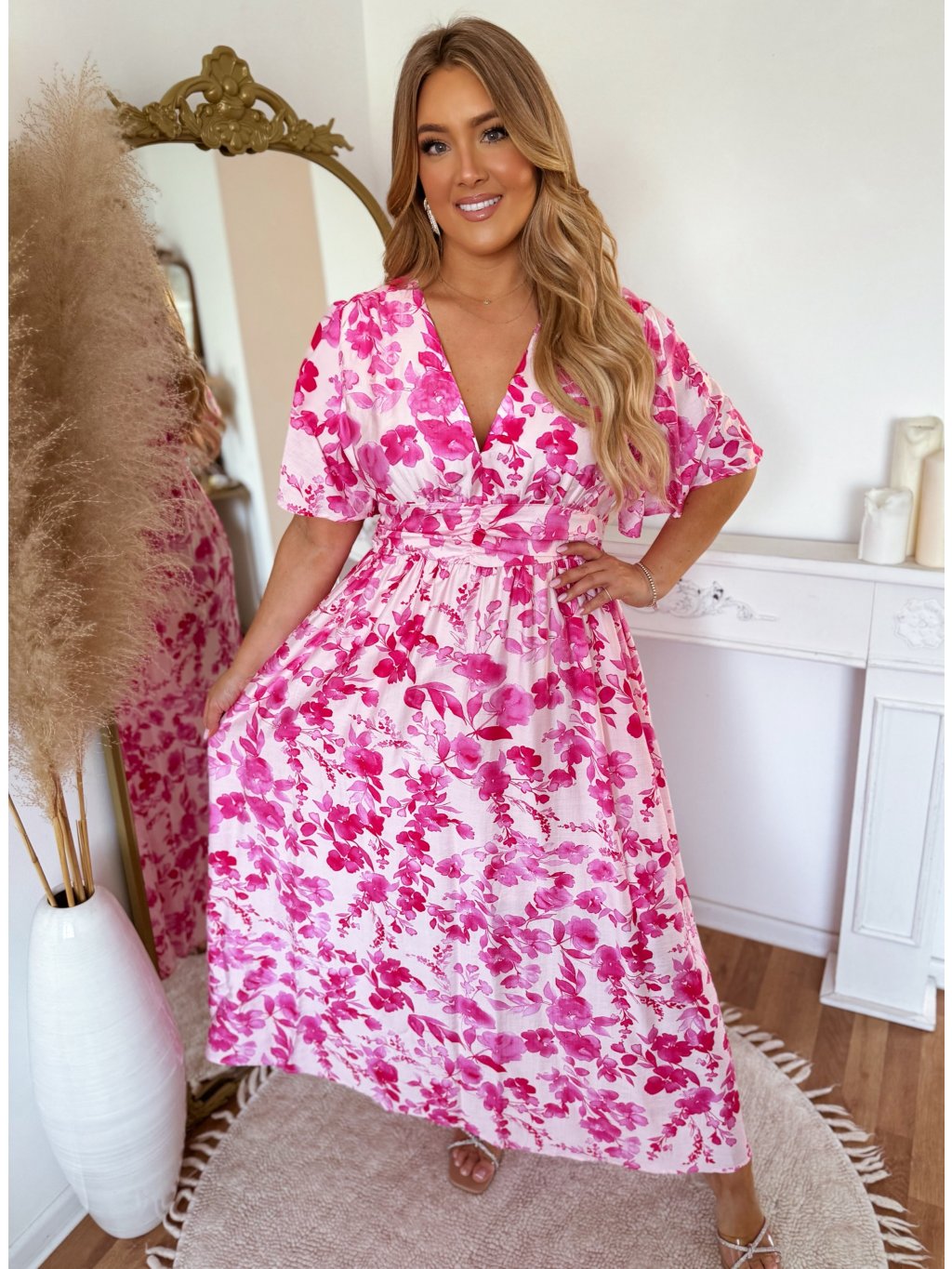 Rózsaszín-fehér virágos maxi ruha rövid ujjú