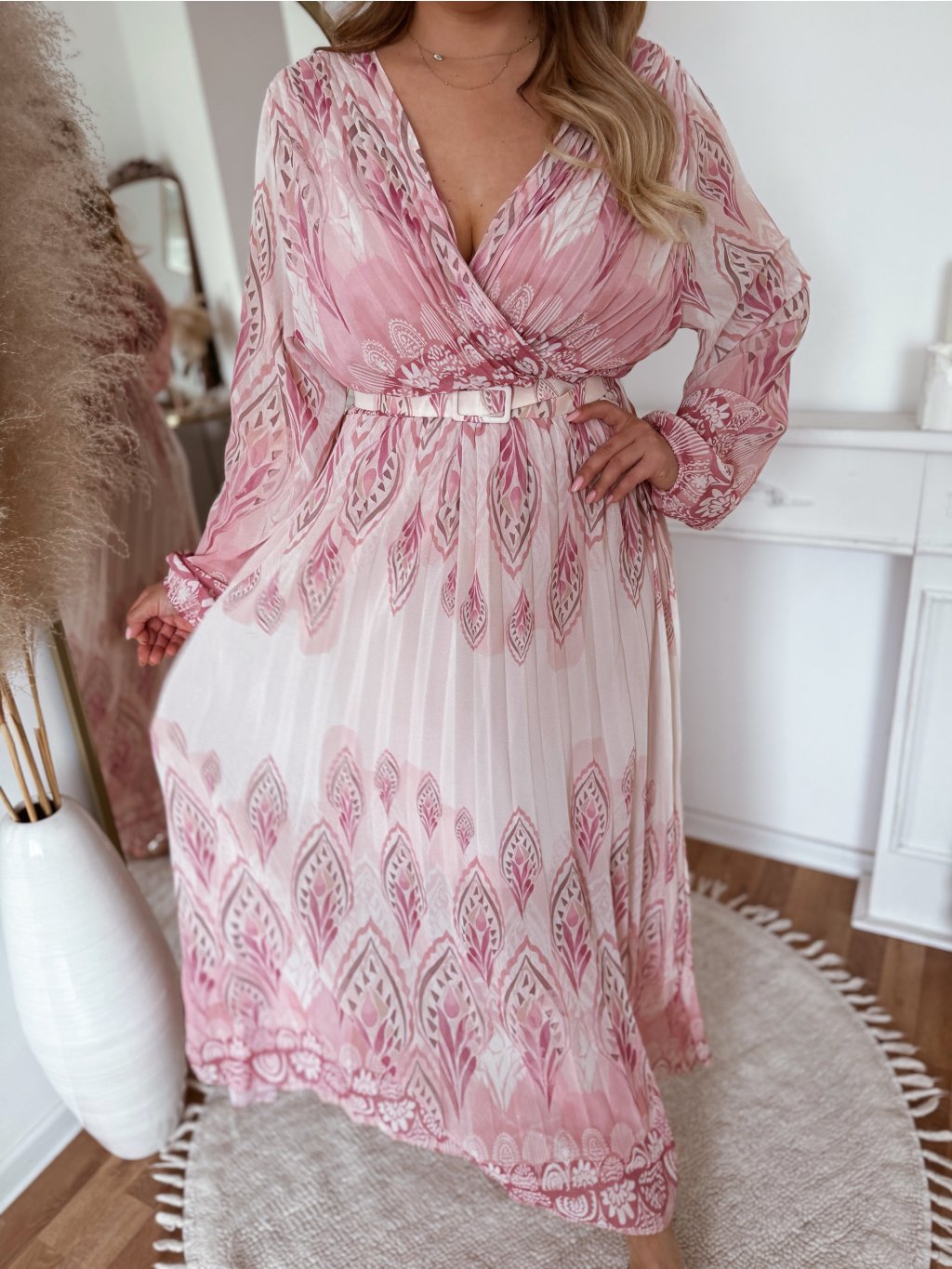 Az övvel ellátott, mintás, bő szabású ruha derekán gumírozás található, és bő szabású. A ruha XL-4XL méretekre illik. A modell 168 cm magas és univerzális méretet visel.