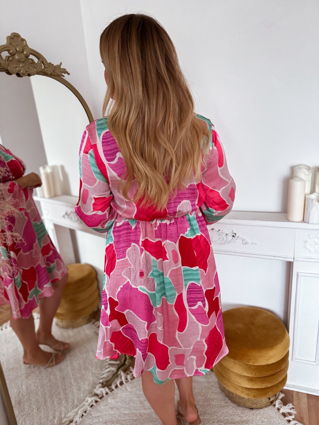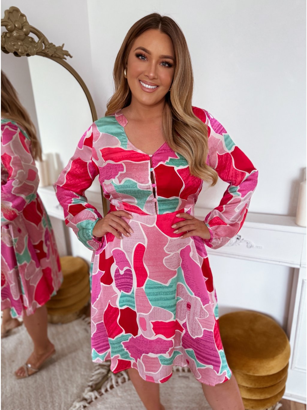 A-vonalú, színes, gombos ruhák mellrészen. A ruhák szűkebb szabásúak a mellen és bő szoknyával rendelkeznek. A model mér 168 cm, és XL-es méretet visel.