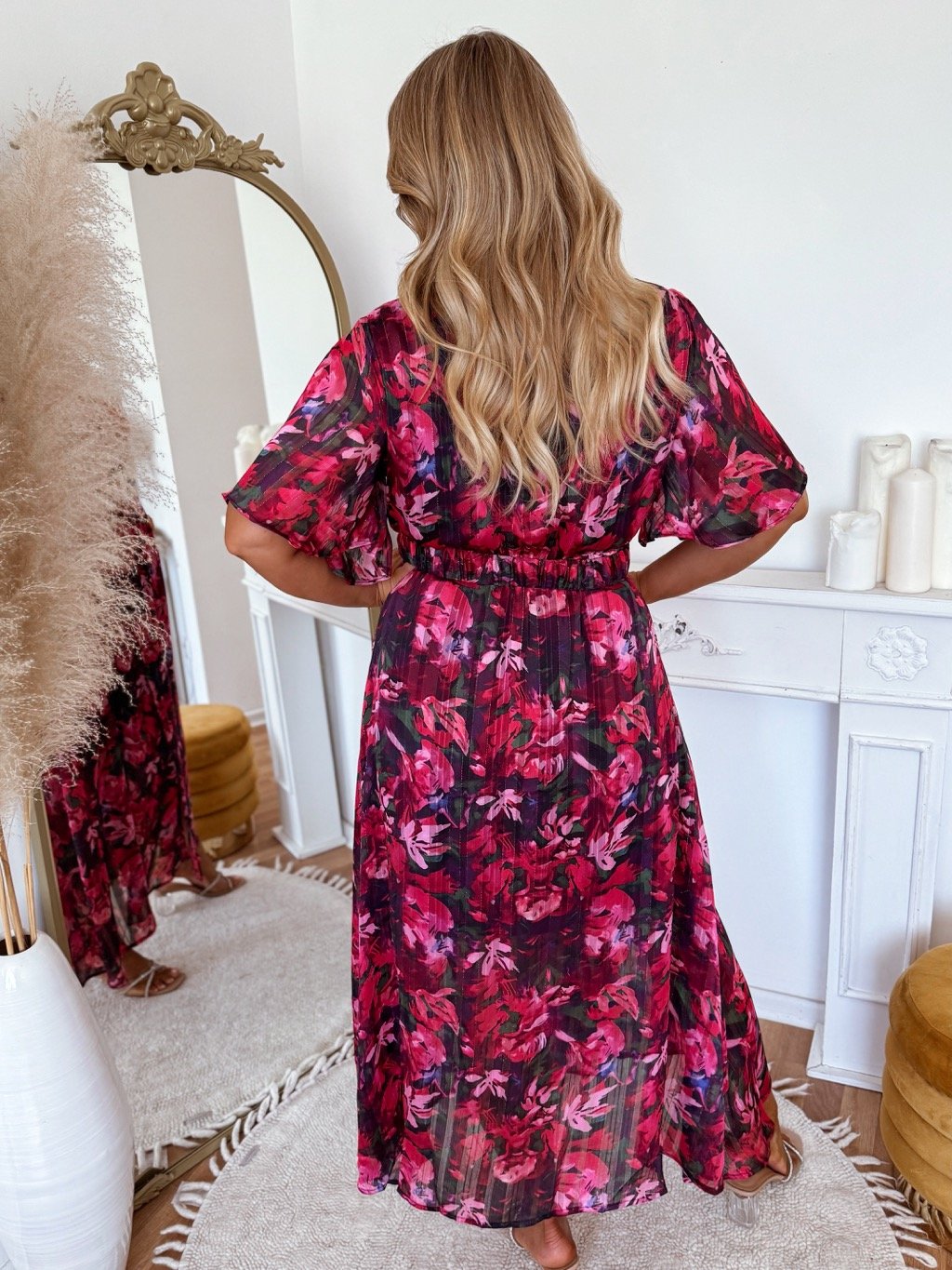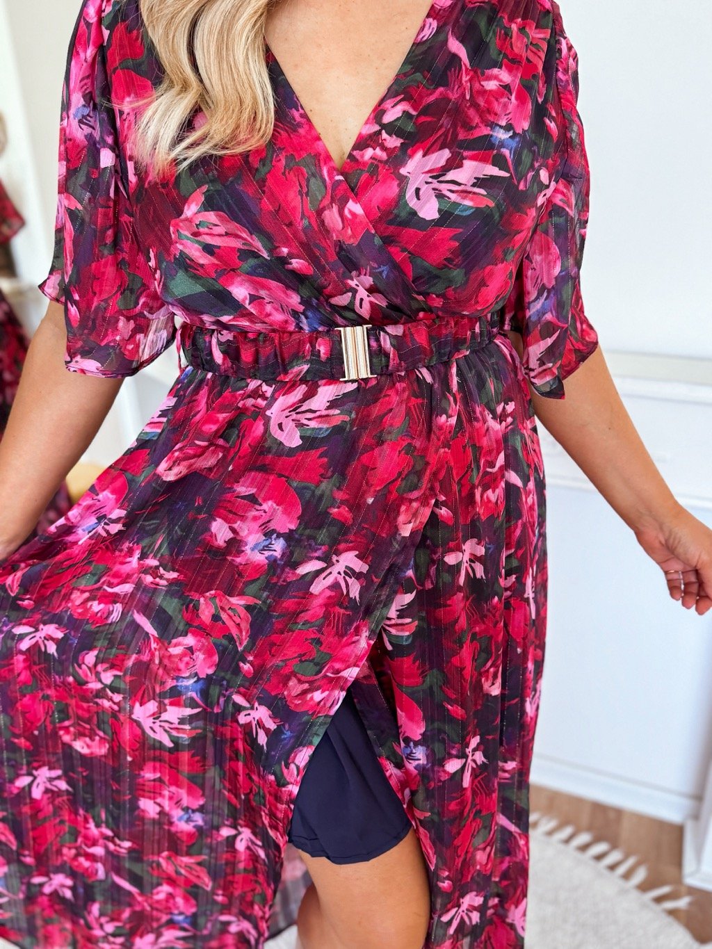 Elegáns, színes mintás, V-nyakú, karcsúsított sziluettet kiemelő övvel ellátott hosszú ruha. Ideális ünnepségekre, esküvőkre és különleges alkalmakra. A ruha derekán gumírozás található. A model mér 168 cm, és XL-es méretet visel.