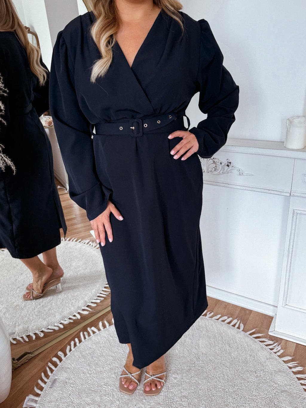 Midi ruha molett nőknek, hosszú, vállon ráncolt ujjal. A sötétkék ruha lazább szabású, és a derékban övvel húzható össze. Hátul diszkrét sliccet talál. A ruha XL-4XL méretekre illik. A modell 168 cm magas és univerzális méretet visel.