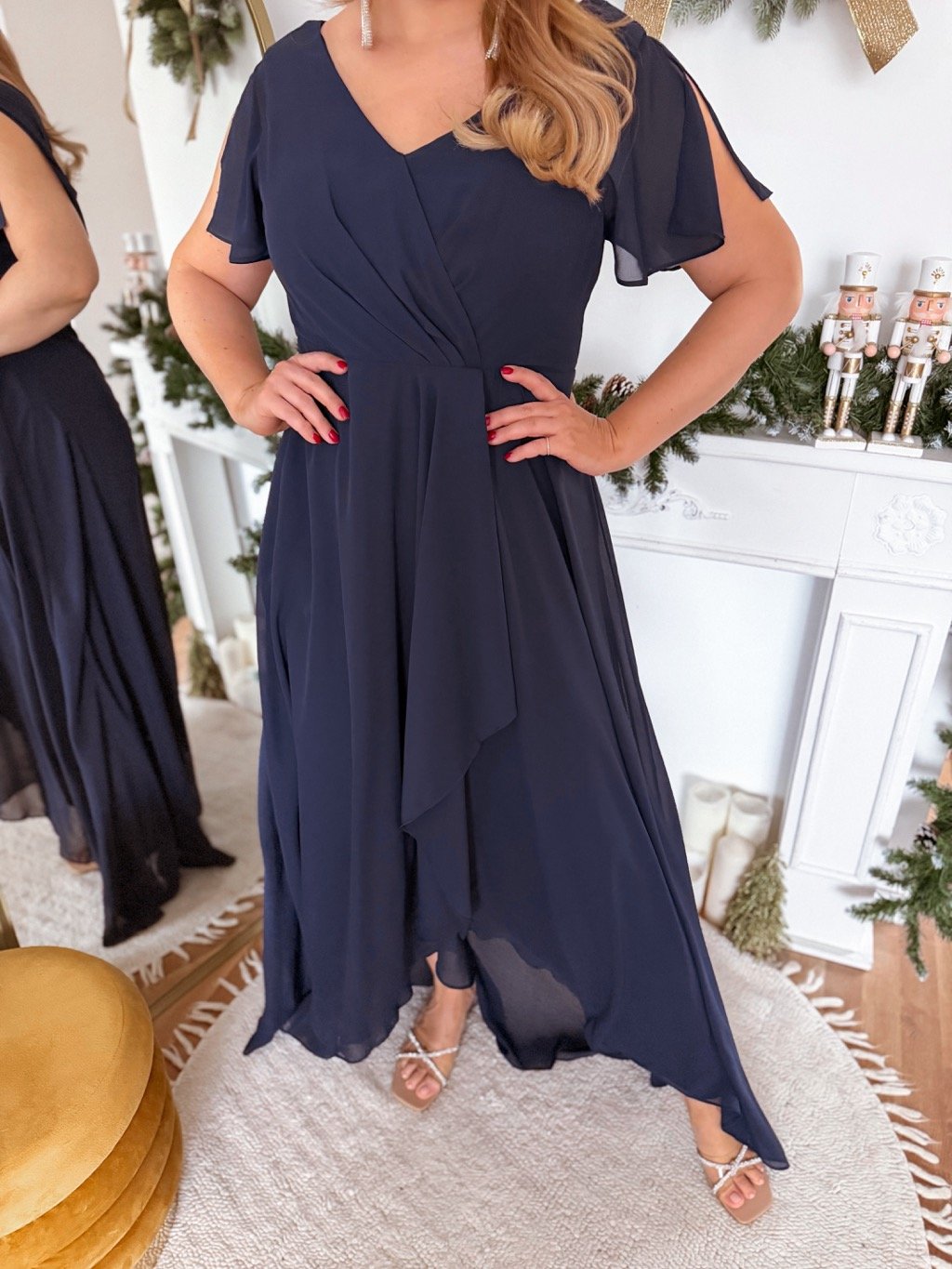 Hosszú estélyi ruha molett nőknek, rövid ujjú. A ruha hátul cipzárral záródik, mellrészen finom habszivacs merevítéssel. A model mér 168 cm, és XL-es méretet visel.