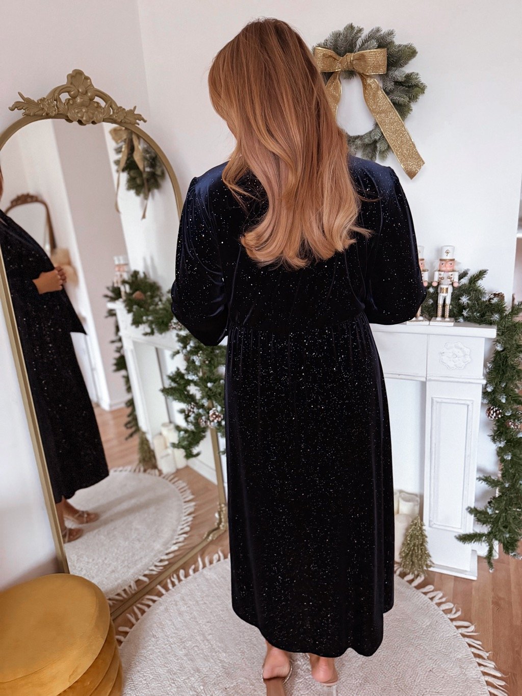 Elegáns bársonyruha finom csillogással az anyagon, a ruha rugalmas és illeszkedik a testhez. A derékrészen elasztikus gumiszalag található, a ruha szoknyája teljesen bő szabású. A modell 168 cm magas és XL/XXL méretet visel.