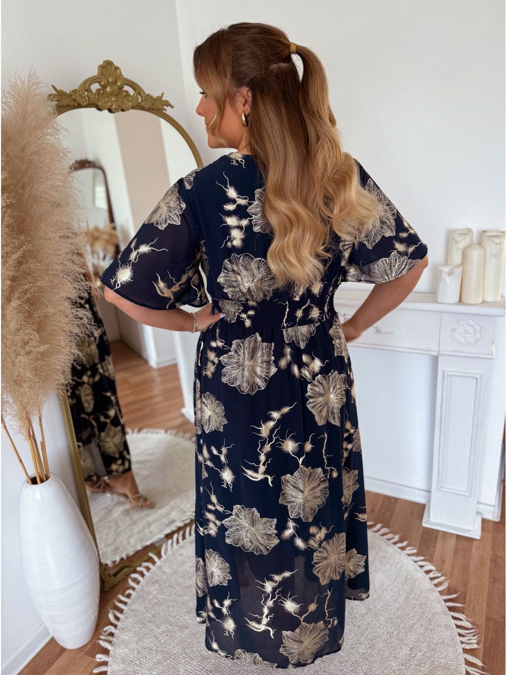 Hosszú, elegáns női ruha moletteknek, rövid ujjal és átlapolt szoknyarésszel. A ruha derekán gumírozás található. A model mér 168 cm, és XL-es méretet visel.