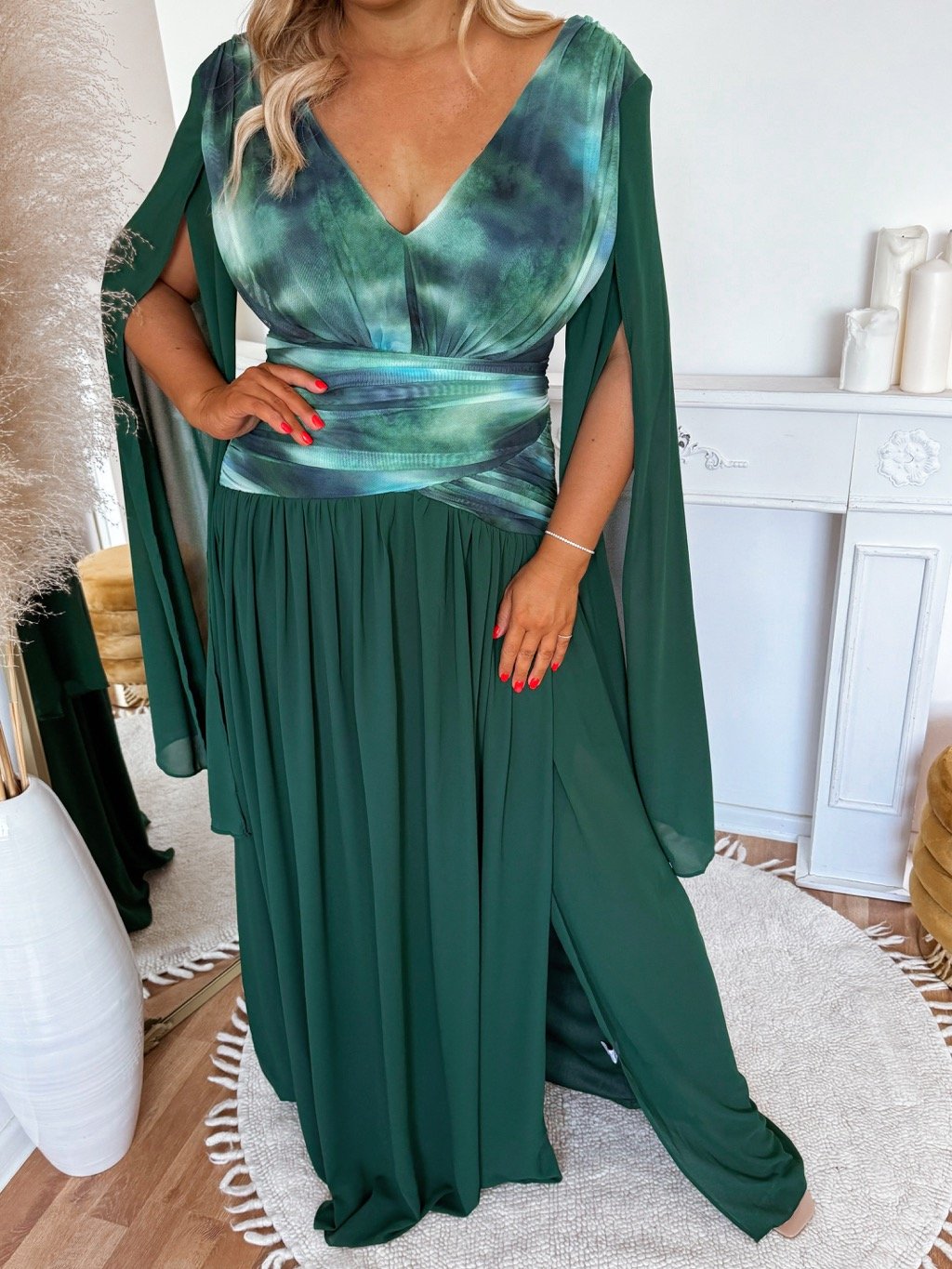 Társasági ruha hasítékkal és drámai ujjal, a ruha felső része rugalmas és testhezálló szabású, hátul cipzárral. A ruha szoknyája teljesen bő szabású. A ruháknak párnázott válltömése van. A modell 168 cm magas, és XL/2XL méretet visel.