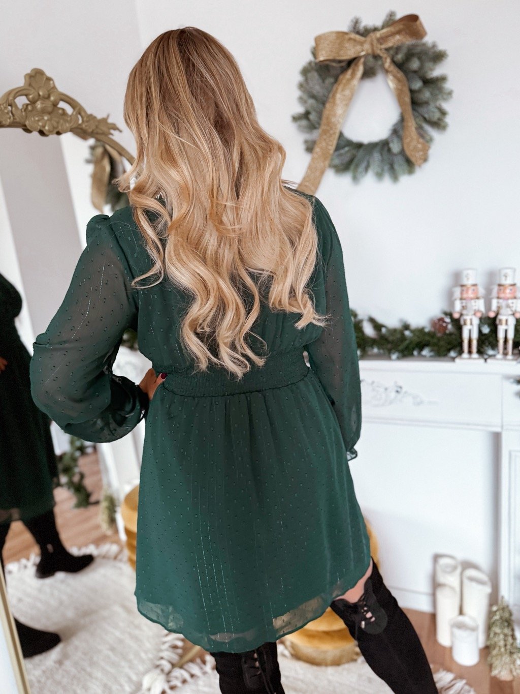 Női sötétzöld elegáns ruha moletteknek hosszú ujjal. A ruha derekában gumírozás található. A model mér 168 cm, és XL-es méretet visel.