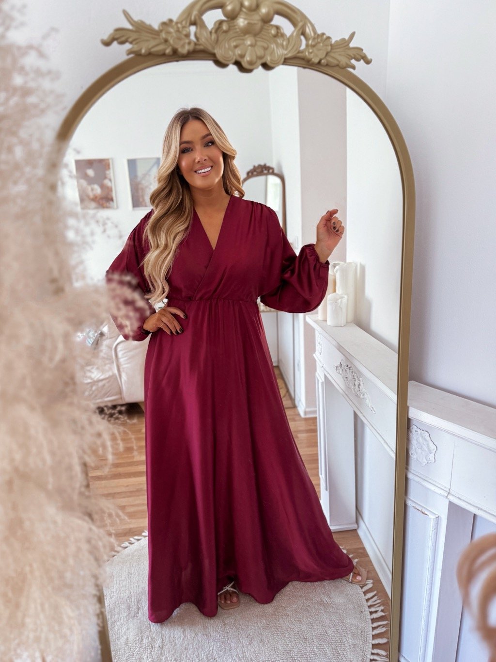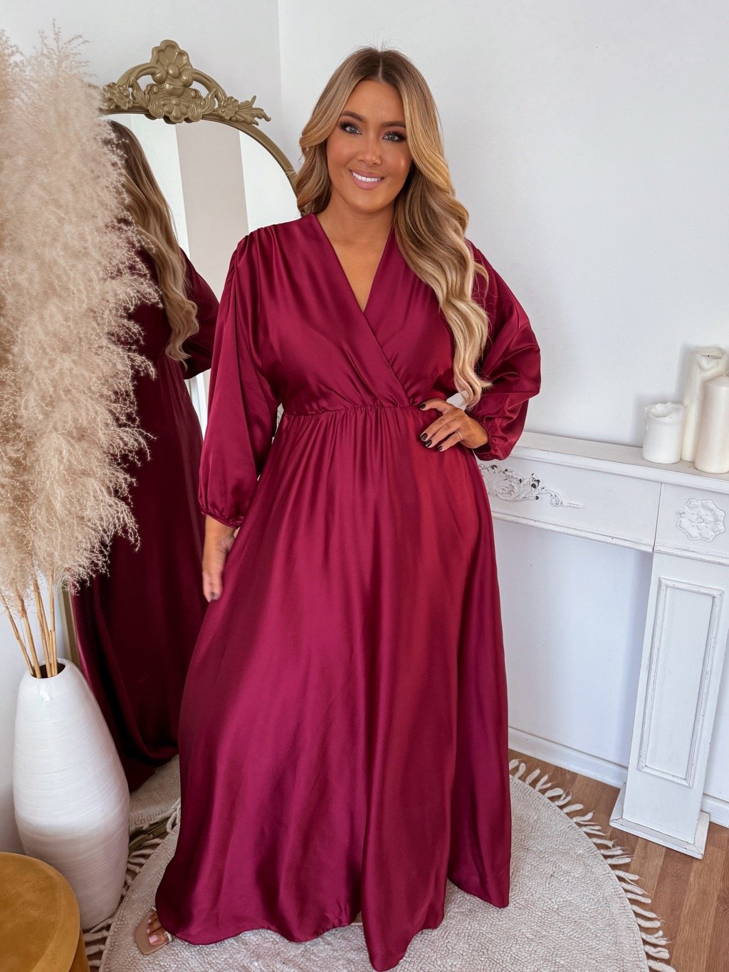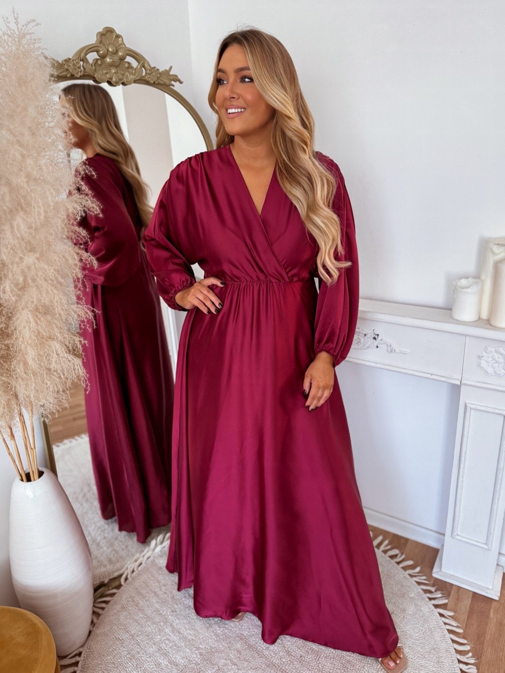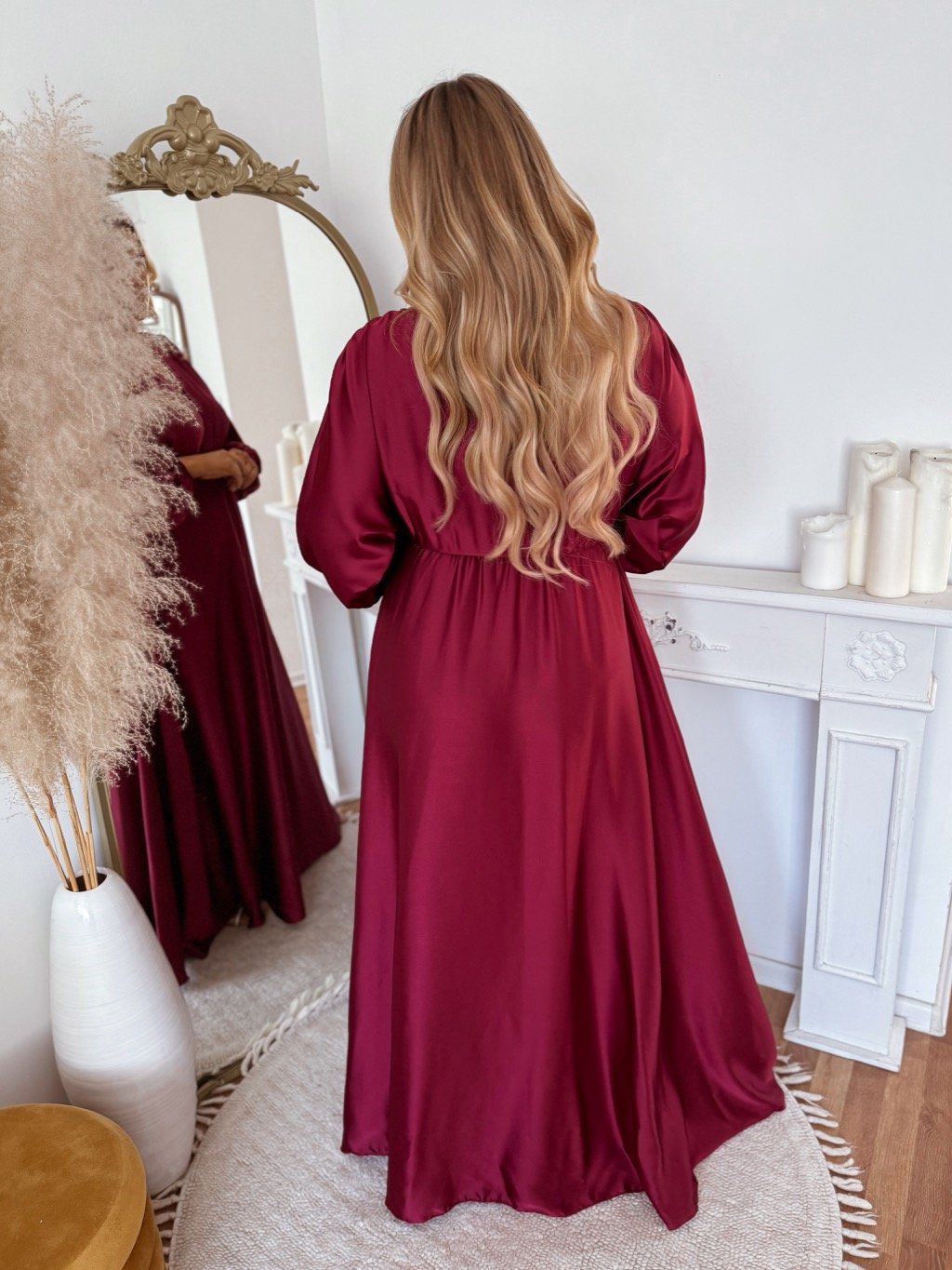A hosszú szatén ruha derekán gumírozás található, a ruha szoknyája teljesen bő szabású. A modell 168 cm magas és L/XL méretet visel.