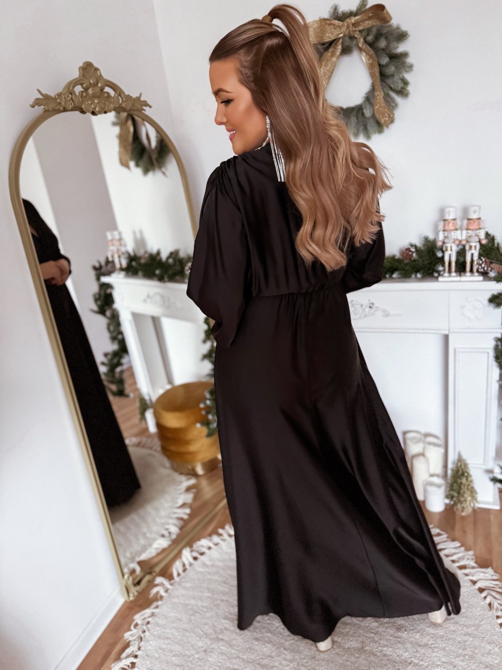 A hosszú fekete szatén ruha derekán gumírozás található, a ruha szoknyája teljesen bő szabású. A modell 168 cm magas és L/XL méretet visel.
