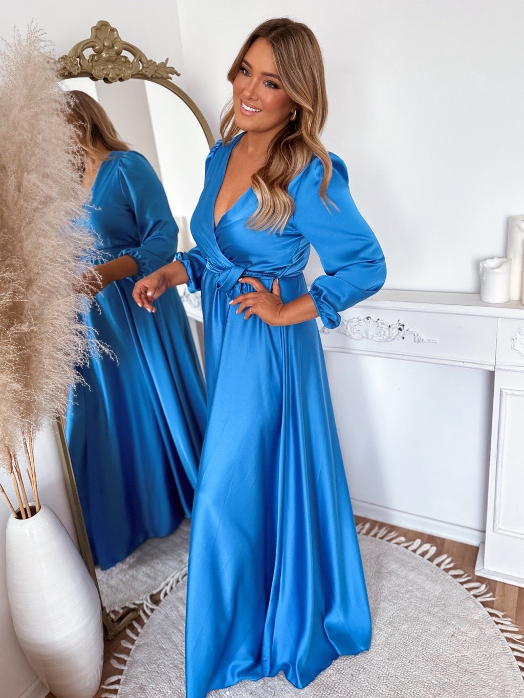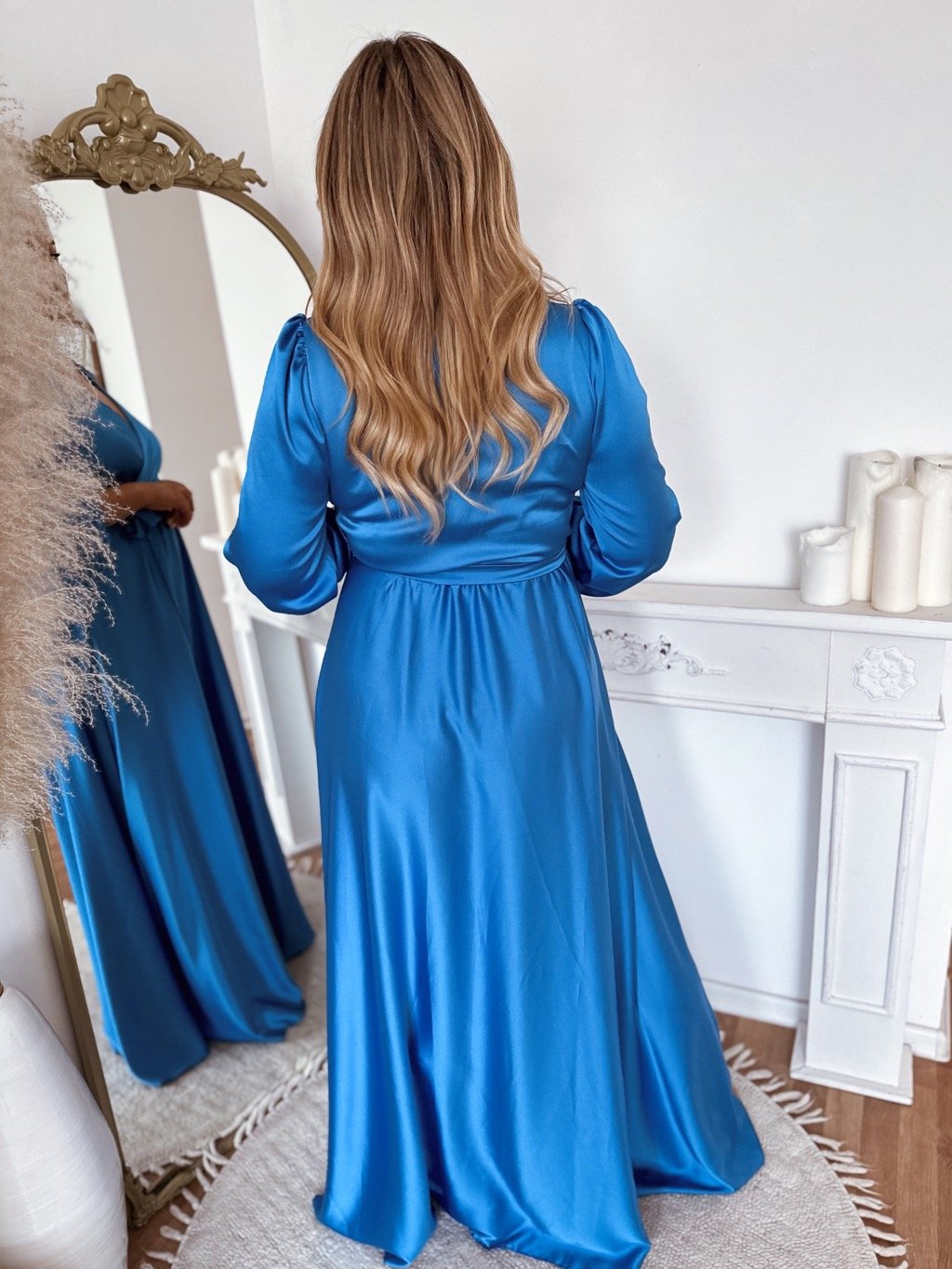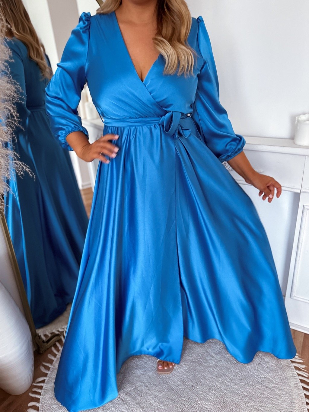 Szatin ruha derékban gumival és anyag övvel. A ruha teljesen bő szoknyával rendelkezik. A modell 168 cm magas és L/XL méretet visel.