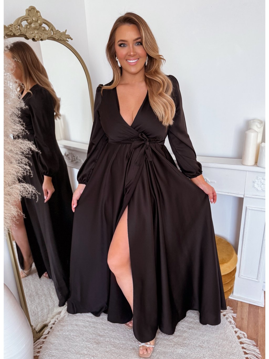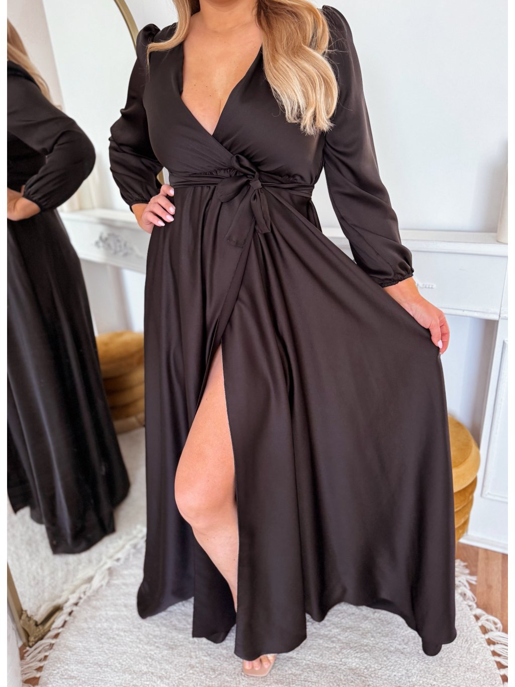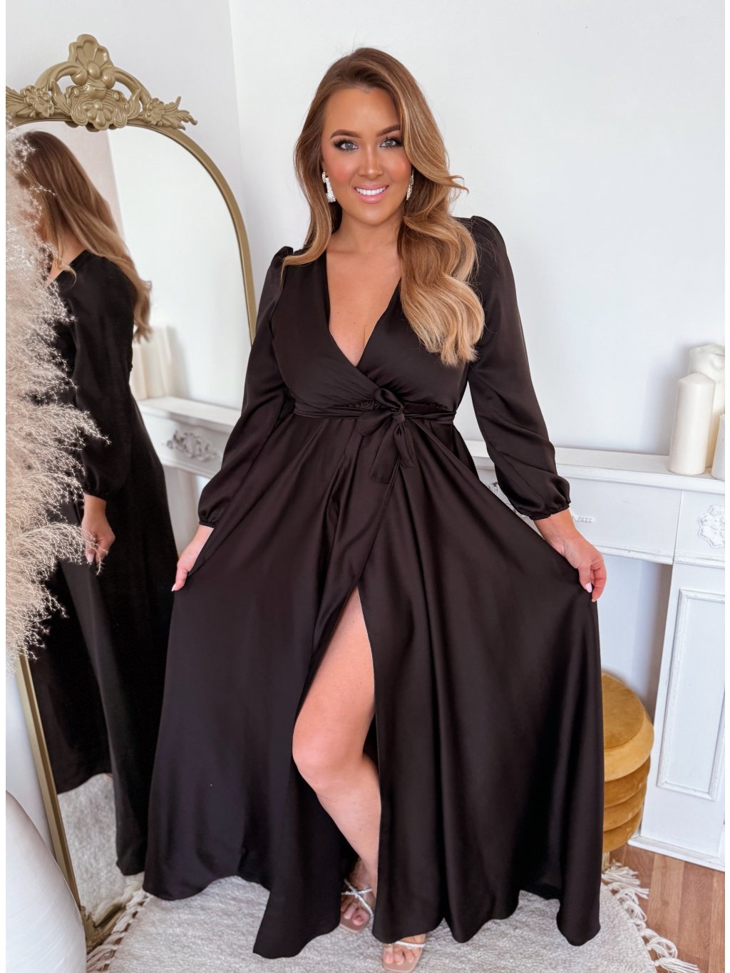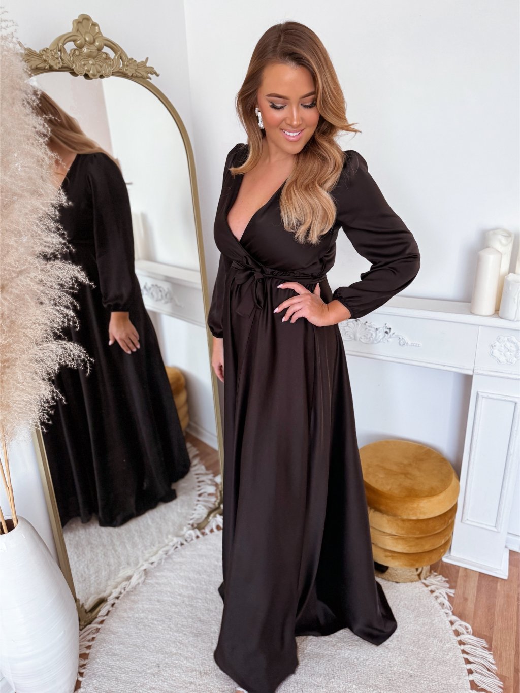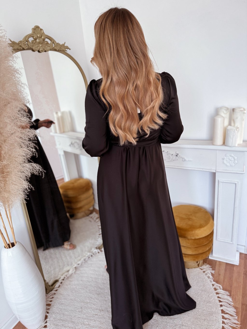 Szatin ruha derékban gumival és anyag övvel. A ruha teljesen bő szoknyával rendelkezik. A strassz öv nem része a ruhának, a kiegészítők kategóriában találja. A modell 168 cm magas és L/XL méretet visel.
