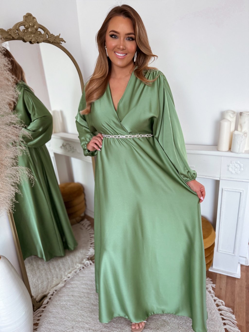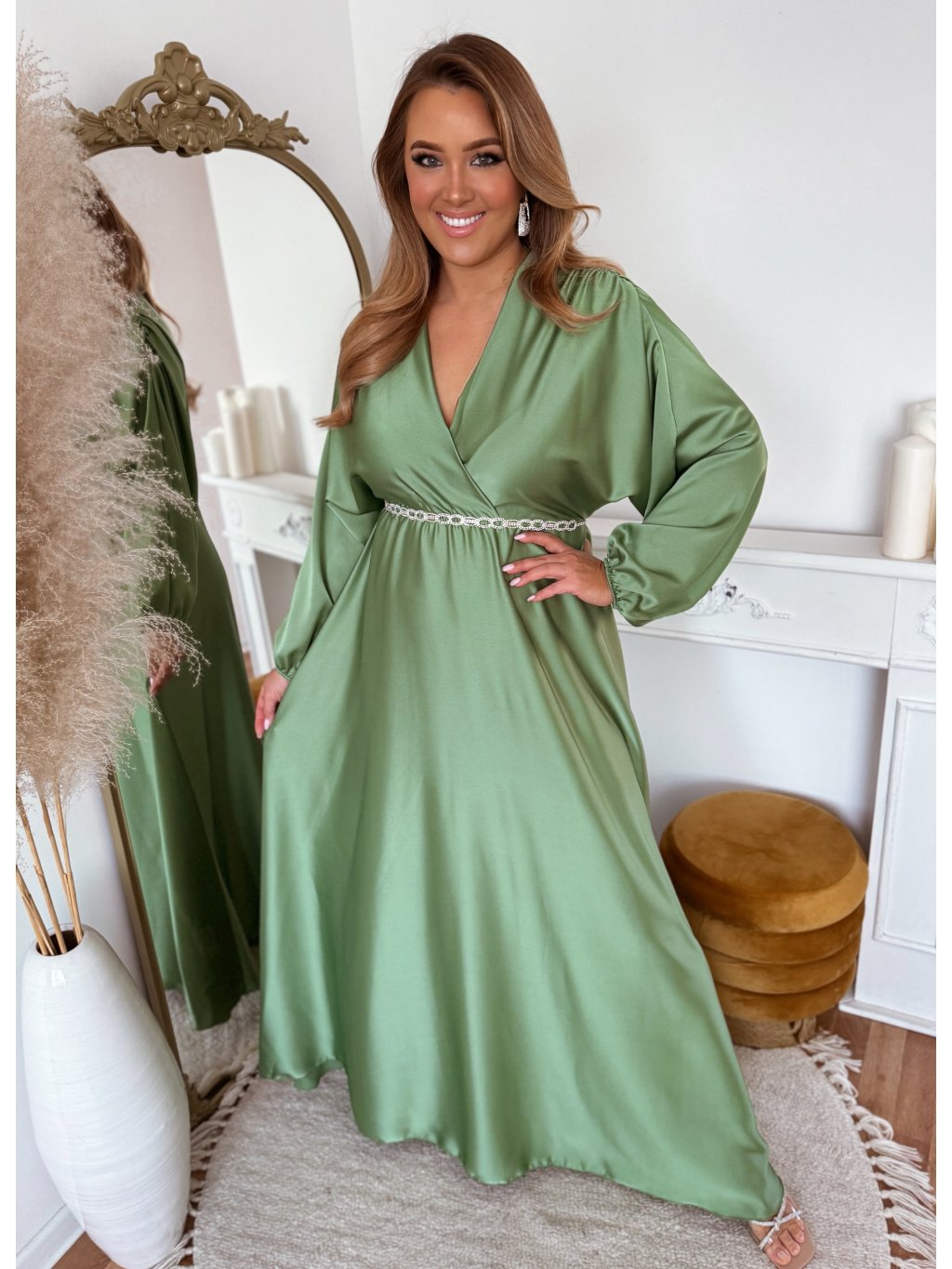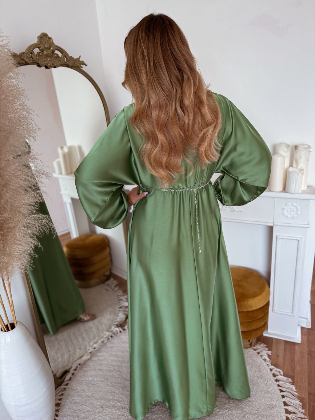 A hosszú szatén ruha derekán gumírozás található, a ruha szoknyája teljesen bő szabású. Az öv nem része a ruhának, a kiegészítők között találja. A modell 168 cm magas és L/XL méretet visel.
