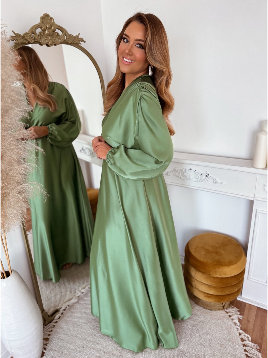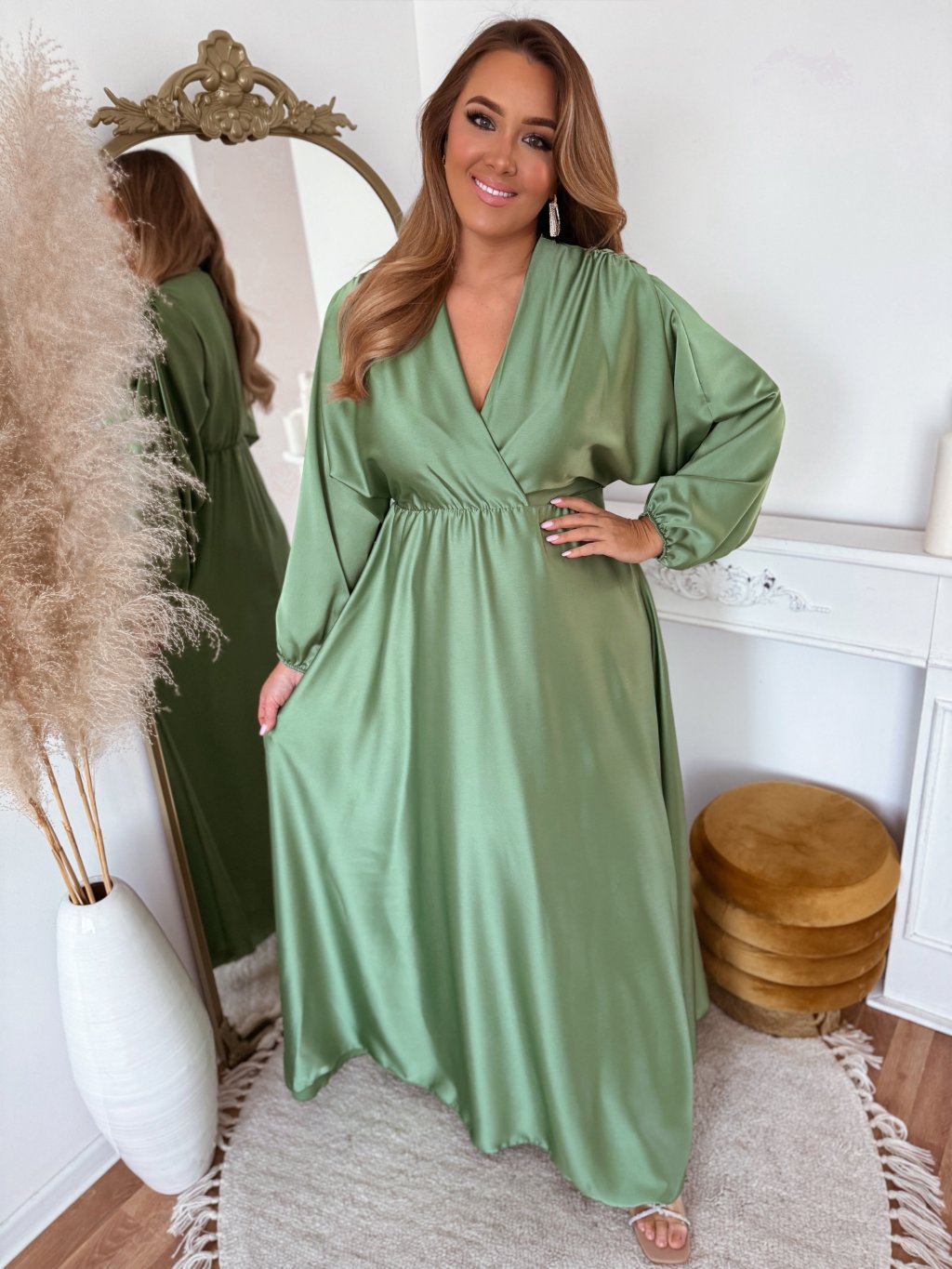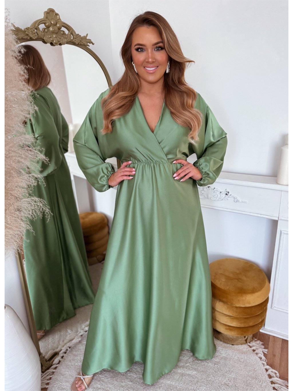 A hosszú szatén ruha derekán gumírozás található, a ruha szoknyája teljesen bő szabású. Az öv nem része a ruhának, a kiegészítők között találja. A modell 168 cm magas és L/XL méretet visel.