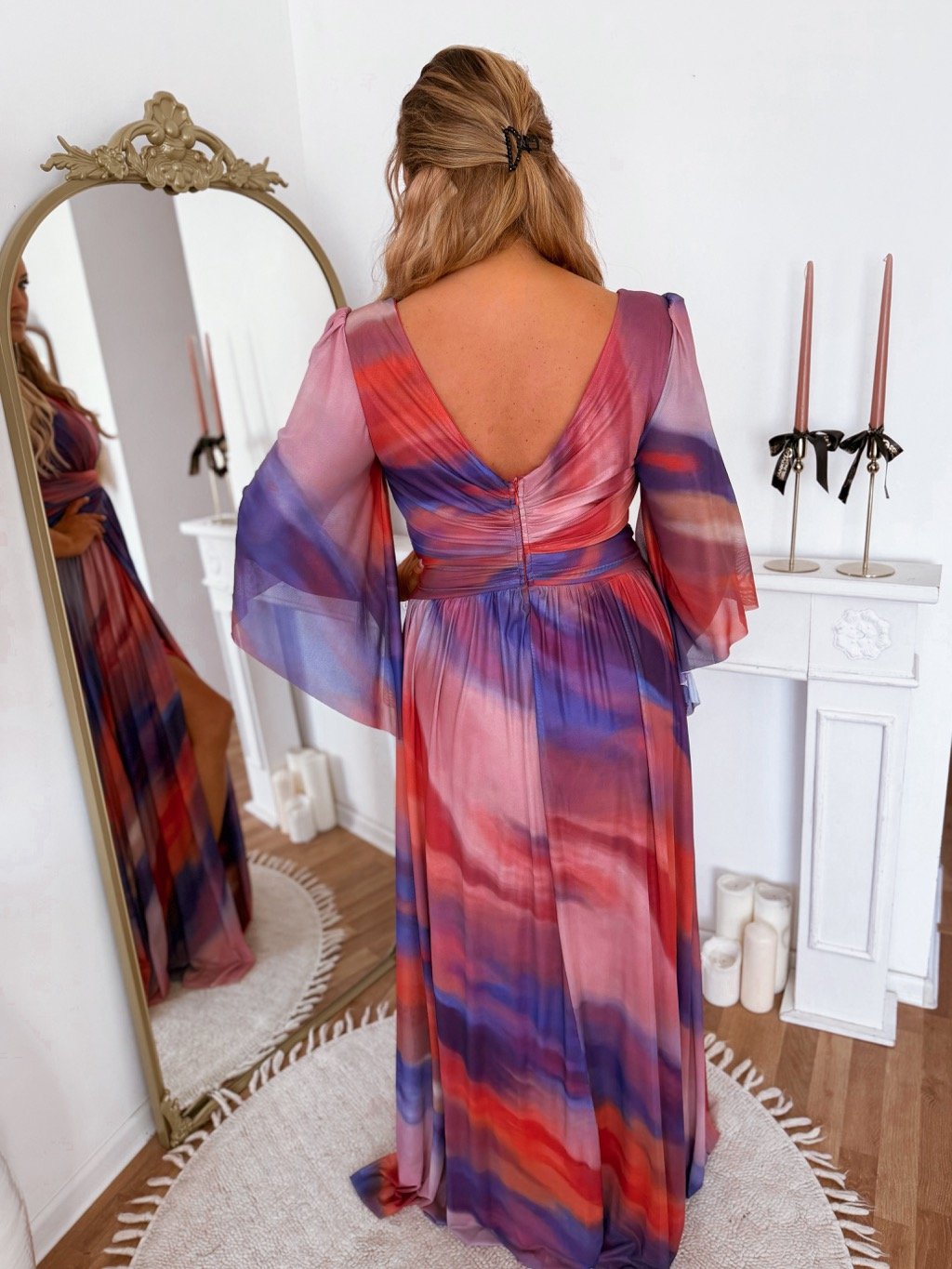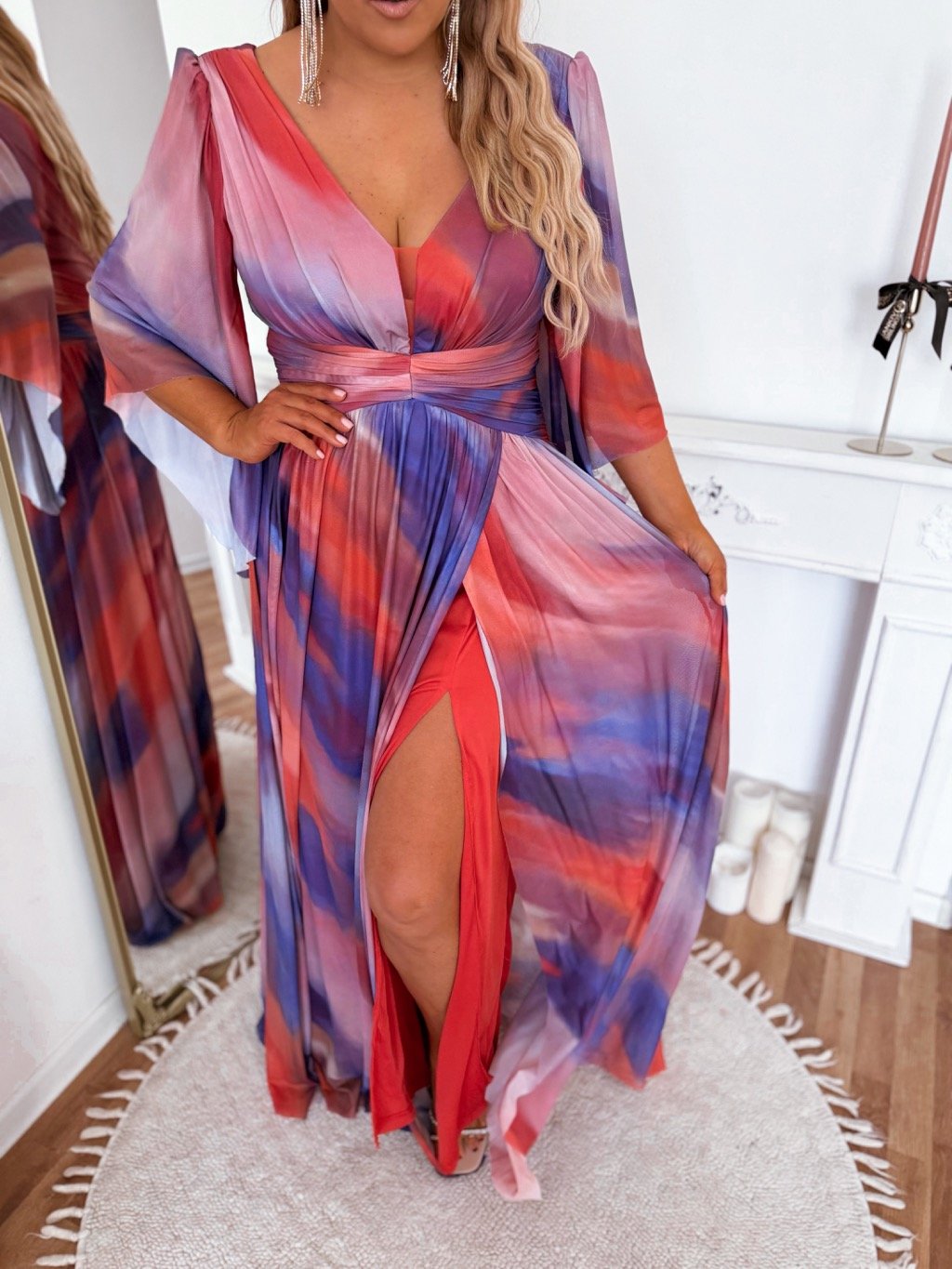 Elegáns, rugalmas, hátul cipzáras és sliccelt alkalmi ruha. Az alkalmi ruha finoman merevített mellrésszel és válltöméssel rendelkezik. A modell 168 cm magas és 2XL/3XL méretet visel.
