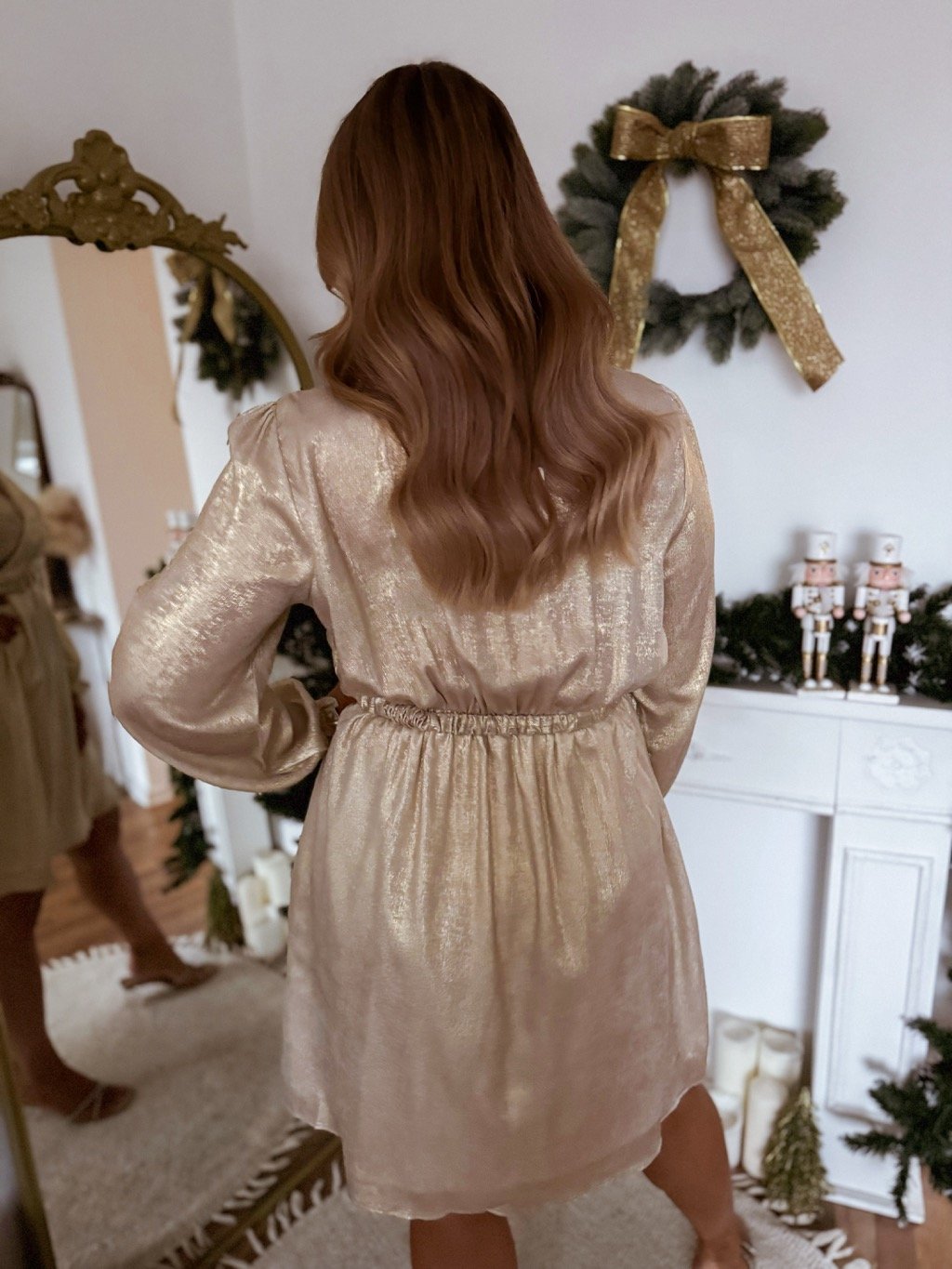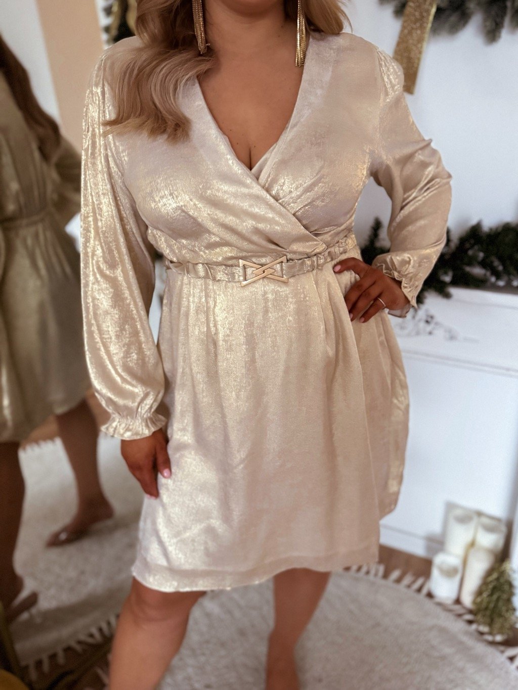 Rövid arany ruha molett nőknek, hosszú ujjal. A ruha derekánál gumírozott, az oldalán bő. A model mér 168 cm, és XL-es méretet visel.