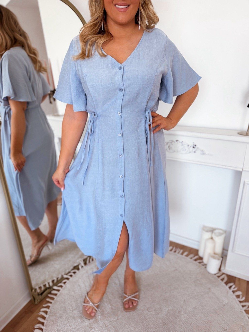 Ingruhák finom gumival a derékban, amely alkalmazkodik az alakhoz és kiemeli a sziluettet. Az oldalsó masnis megkötés lehetővé teszi a ruha egyéni meghúzását szükség szerint, így gyönyörűen illeszkedik, nőies és hízelgő. A model mér 168 cm, és XL-es méretet visel.
