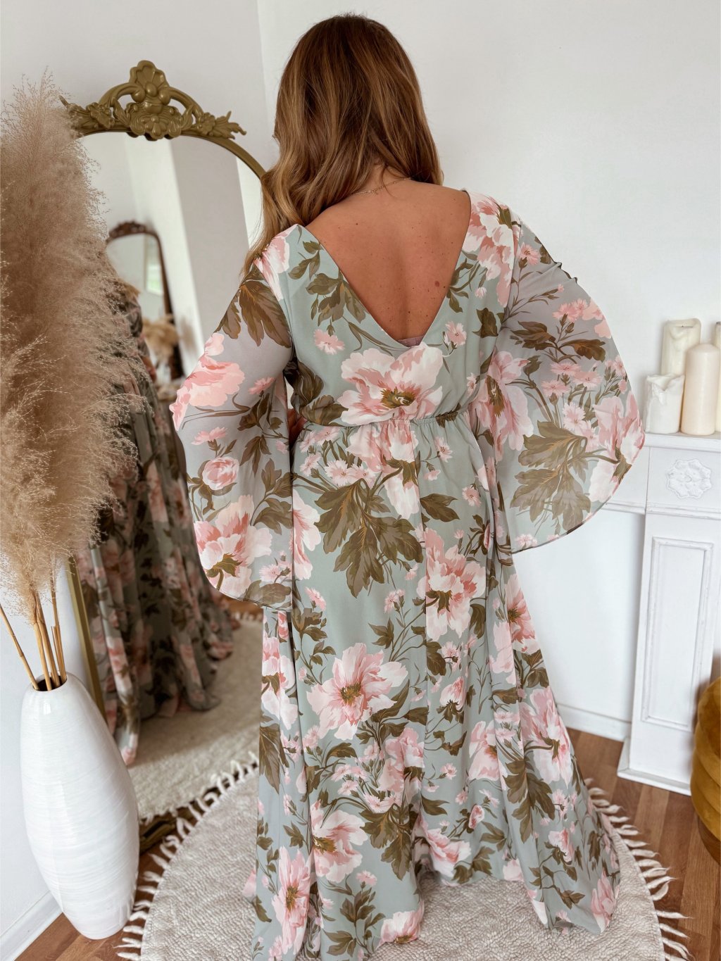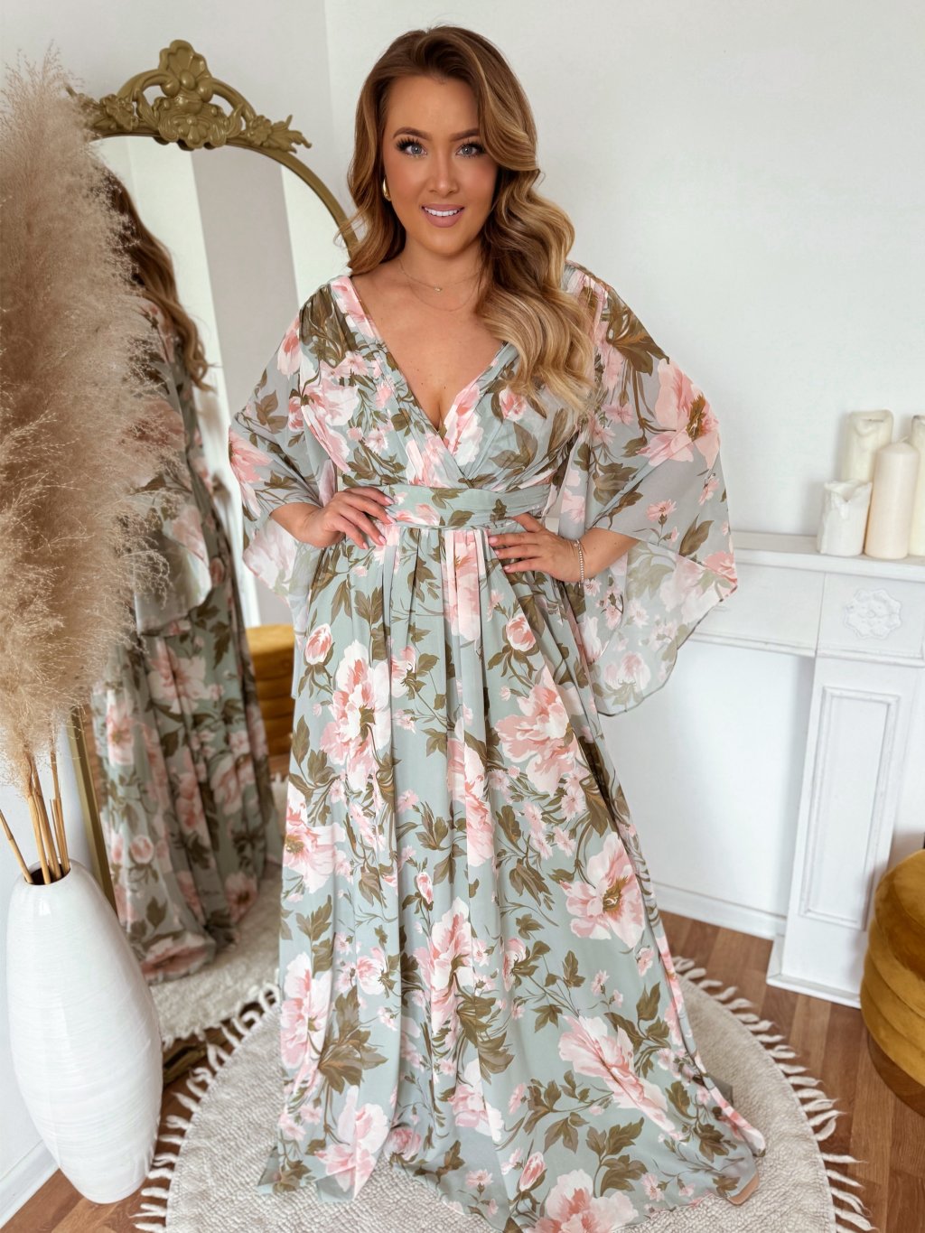 Hosszú, elegáns maxiruhák mély kivágással és drámai ujjal. A moletteknek szánt alkalmi ruha hátul bevarrt gumírozással rendelkezik a derékrészen. A szoknya teljesen bő. A szoknya teljesen bő. A modell 168 cm magas és XL (42) méretet visel.