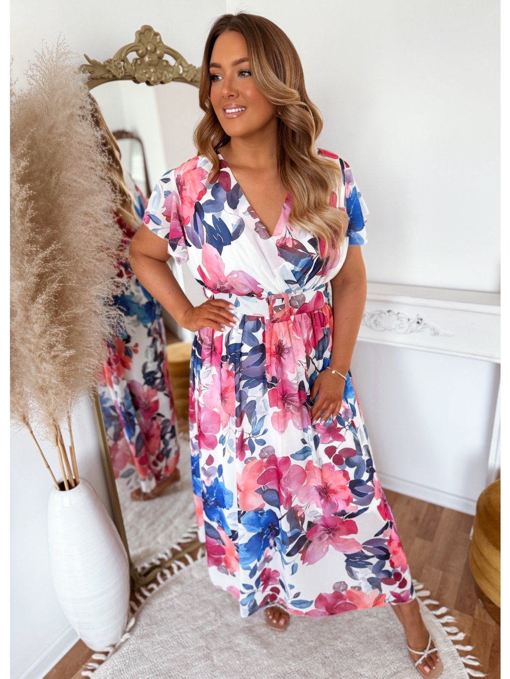 Elegáns, rövid ujjú, bő szoknyás, hosszú ruha. A ruha derekában gumírozás található. A feltűnő virágmintának köszönhetően ezek a ruhák tökéletes választás nyári ünnepségekre, esküvőkre vagy nyaralásokra. A modell 168 cm magas és L/XL méretet visel.