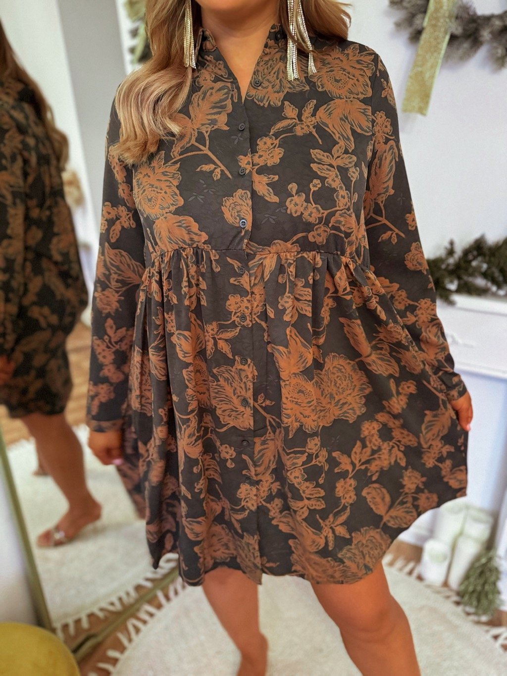 A mintás ingruha teljesen laza szabású. A modell 168 cm magas és L/XL méretet visel.