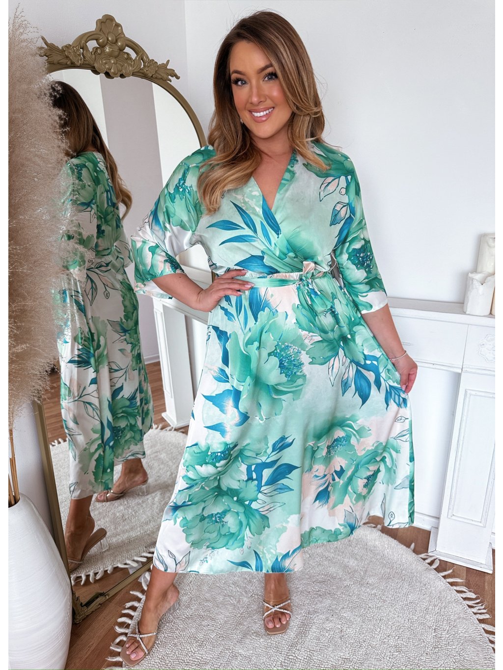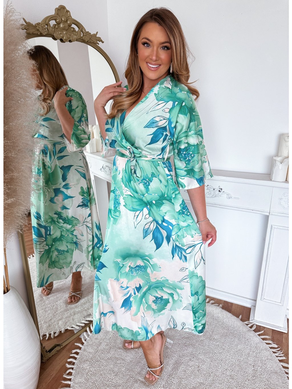 Elegáns, hosszú, virágmintás ruha háromnegyedes ujjal és övvel. A ruha sima anyagból készült, lazább szabású, és gumírozás van a derekán. A modell 168 cm magas és L/XL méretet visel.