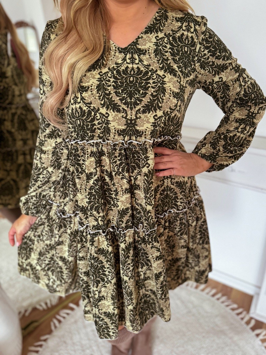 Zöld V-nyakú, hosszú ujjú miniruha. A modell 168 cm magas és L/XL méretet visel.