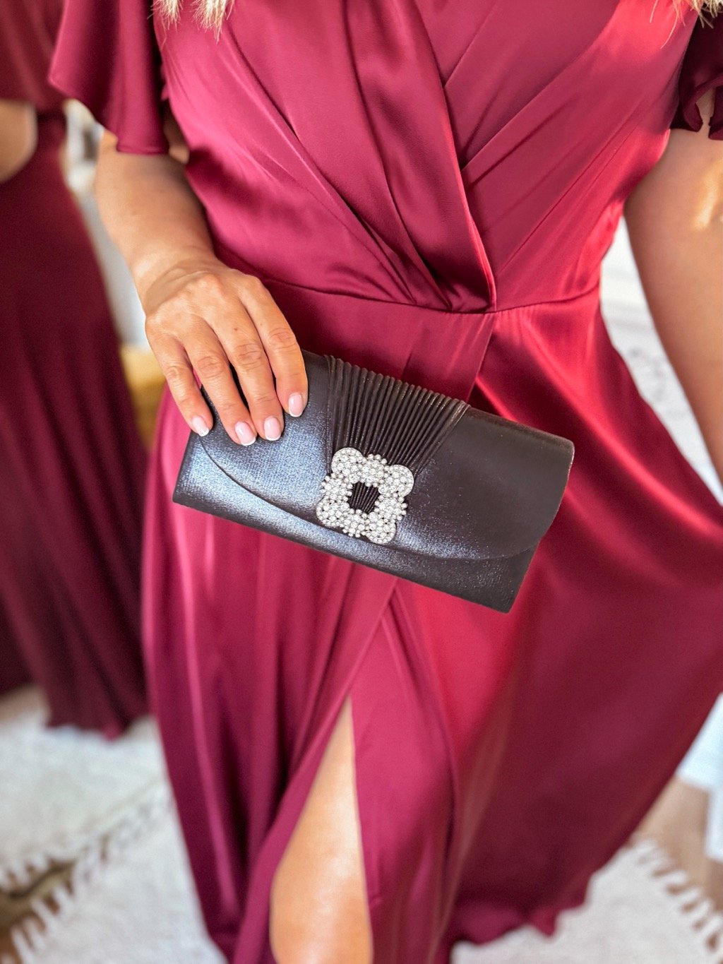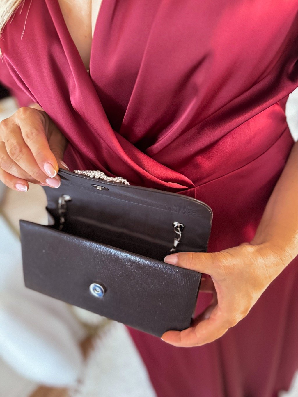 Elegáns estélyi táska csillogó felülettel, tökéletes kiegészítő esküvőkre, bálokra vagy esti ünnepségekre. A strasszos csat és a láncos pánt luxusérzetet kölcsönöz a táskának, melyet kézben vagy kényelmesen a vállon is viselhet.