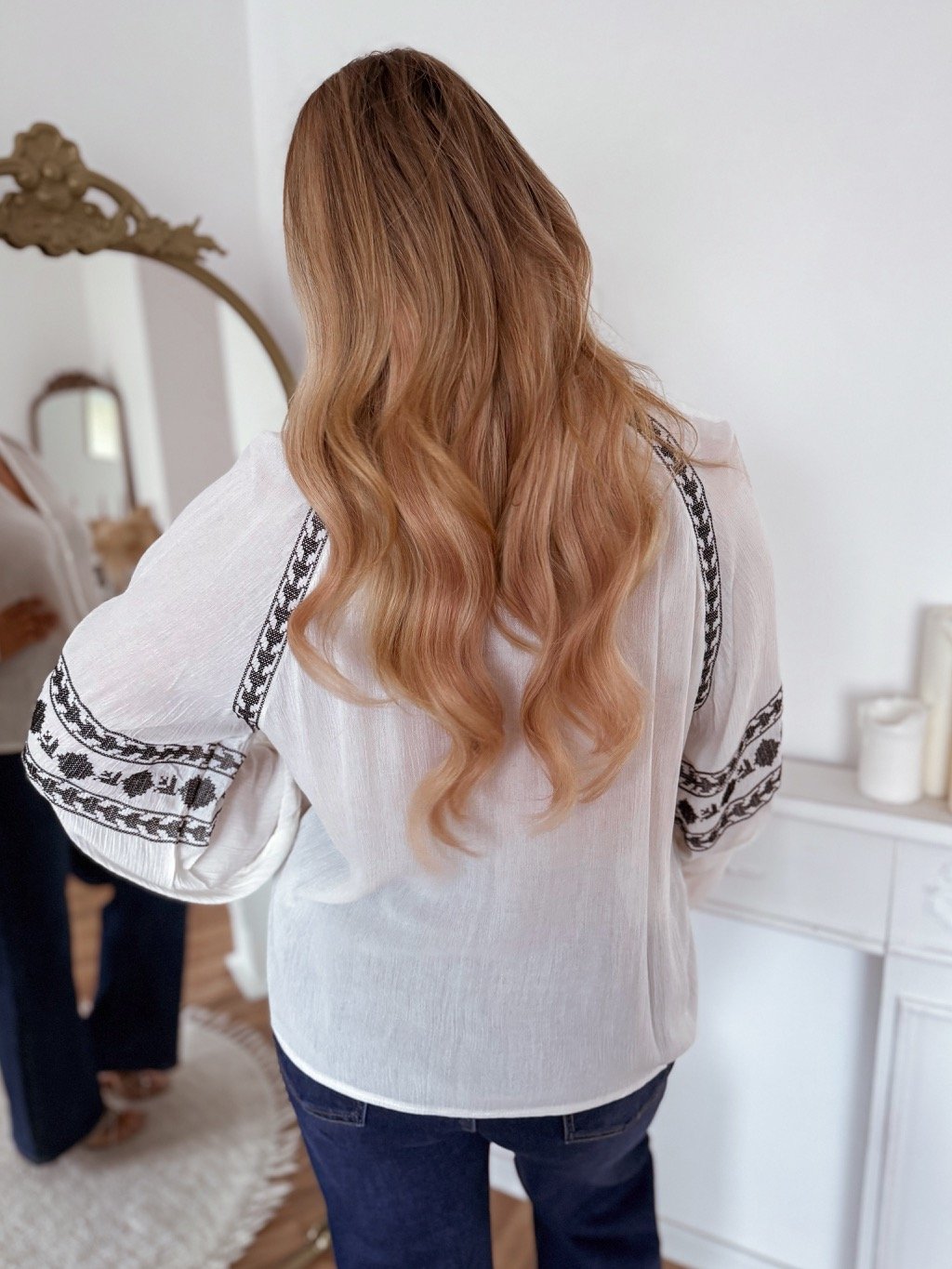 Bohém stílusú, bő, női pamut blúz gombos záródással és hímzéssel. A modell 168 cm magas és L/XL méretet visel.