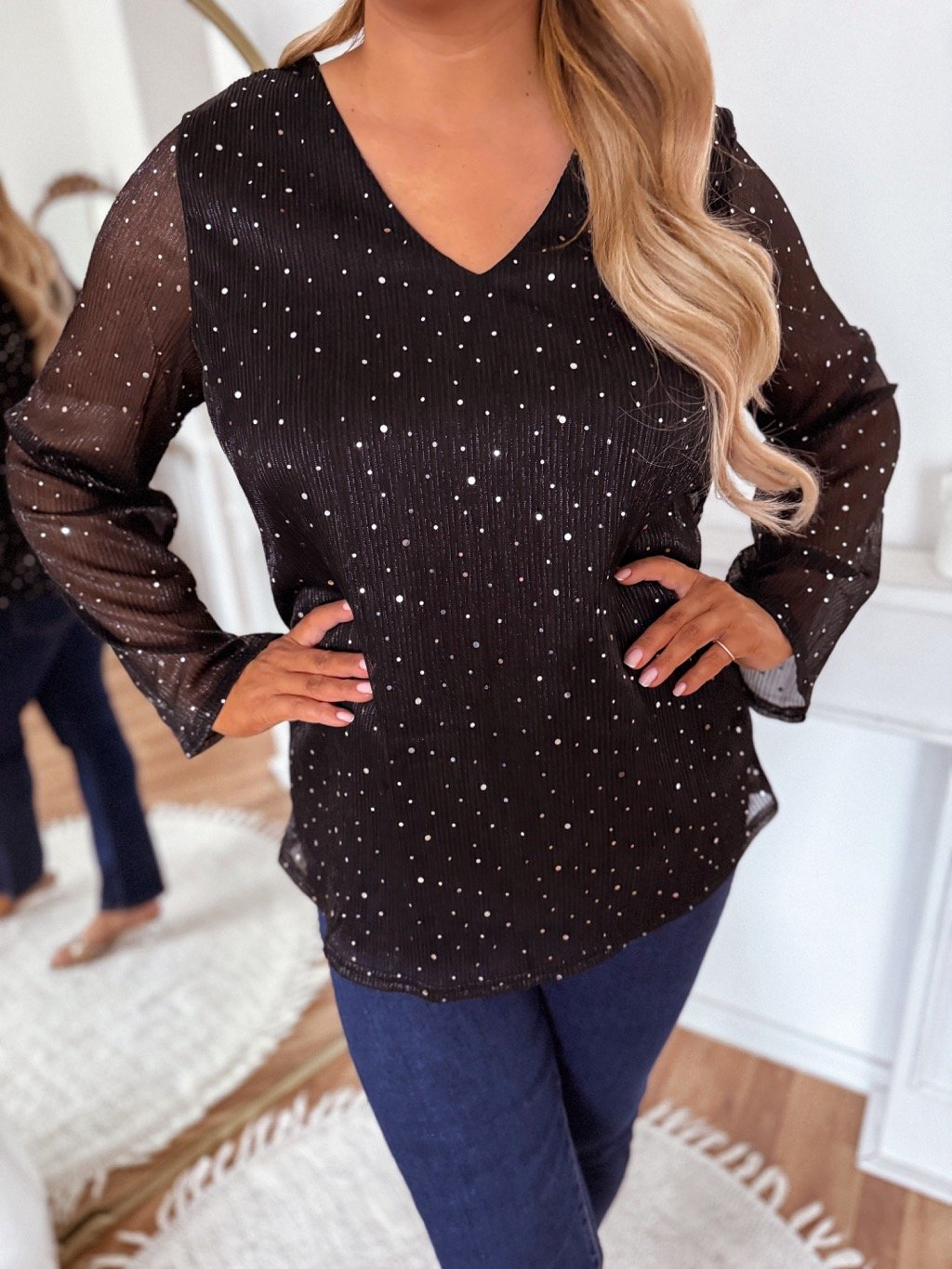 Elegáns, csillogó, fekete színű top, rugalmas, átlátszó ujjakkal. A modell 168 cm magas és L/XL méretet visel.