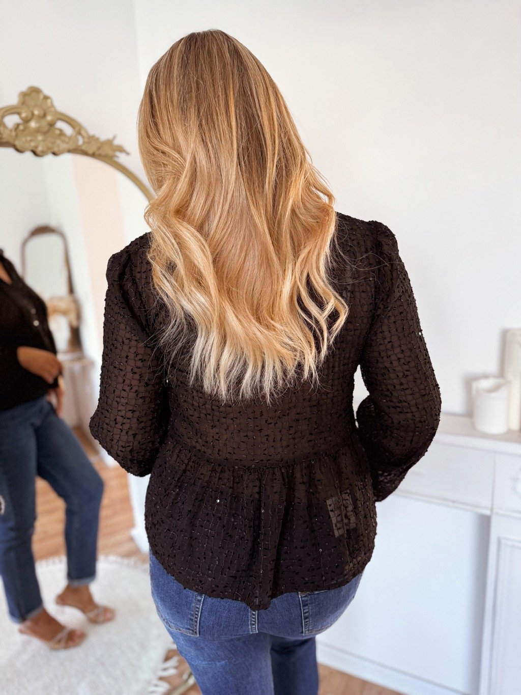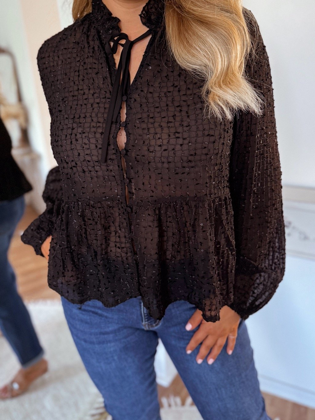 Női blúz textúrával és elöl gombolással, átlátszó, test színű fehérnemű viselését javasoljuk. A blúz laza szabású. A model mér 168 cm, és XL-es méretet visel.