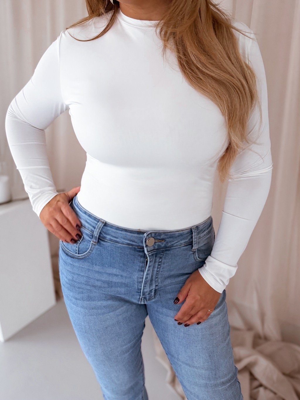 Elasztikus, testhezálló, hosszú ujjú body. Ideális darab minden napra – kombinálhatod farmerrel, szoknyával és elegáns nadrággal is. A model mér 168 cm, és XL-es méretet visel.