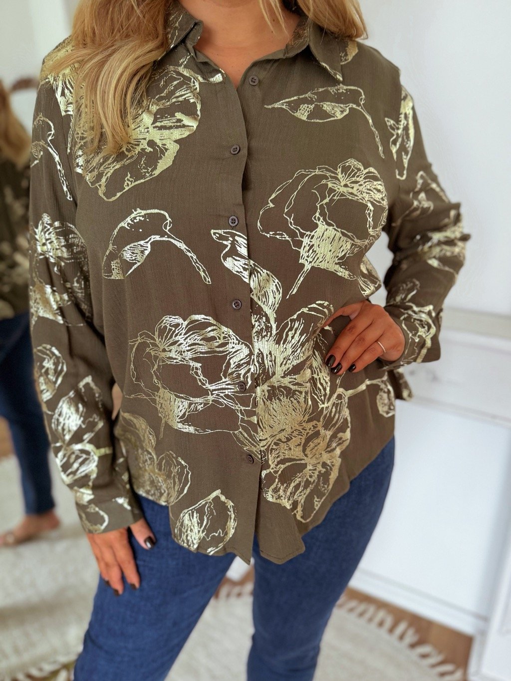 Elegáns női pamut blúz khaki színben, arany virágokkal. A könnyű, légáteresztő anyag egész napos kényelmet biztosít. A modell 168 cm magas és L/XL méretet visel.