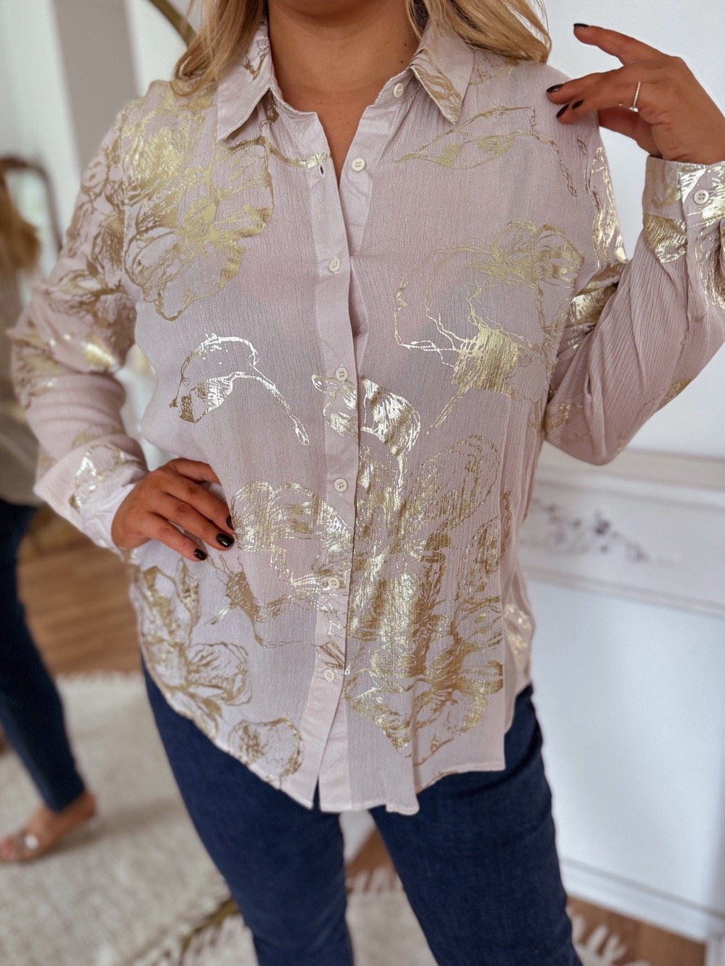 Elegáns női pamut blúz, krémszínű, arany virágmintával. A könnyű, légáteresztő anyag egész napos kényelmet biztosít. A modell 168 cm magas és L/XL méretet visel.