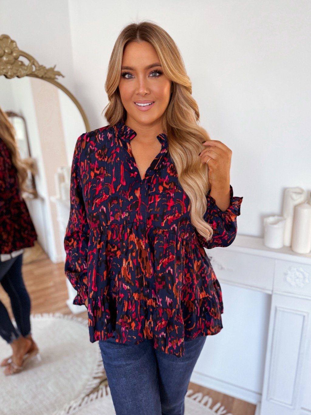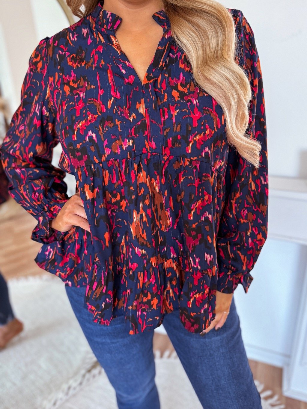 Női mintás blúz molett hölgyeknek, hosszú ujjal. A blúznak laza szabása van, és enyhén rugalmas. A model mér 168 cm, és XL-es méretet visel.