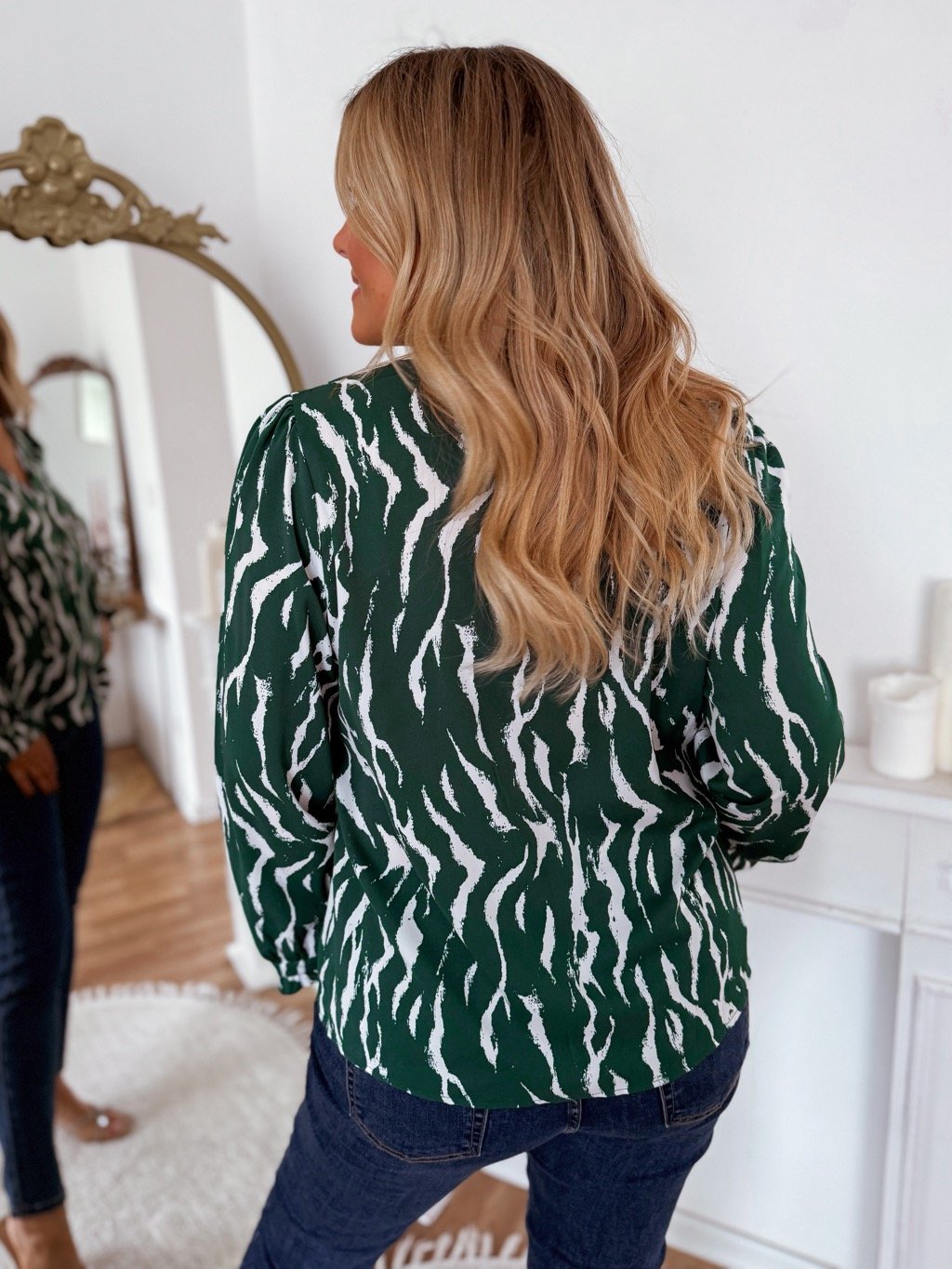 Mintás női blúz molett nőknek gombos, V-nyakú és hosszú ujjú. A blúz enyhén rugalmas, lazább szabású. A model mér 168 cm, és XL-es méretet visel.