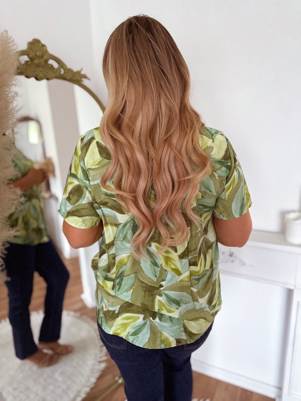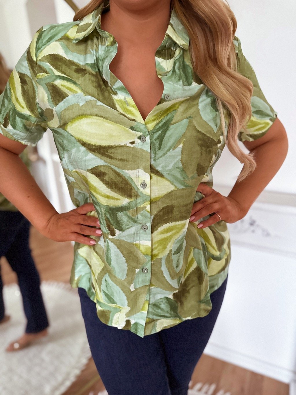 Női pamut-vászon ing, rövid ujjú, zöld mintával. A modell 168 cm magas és L/XL méretet visel.